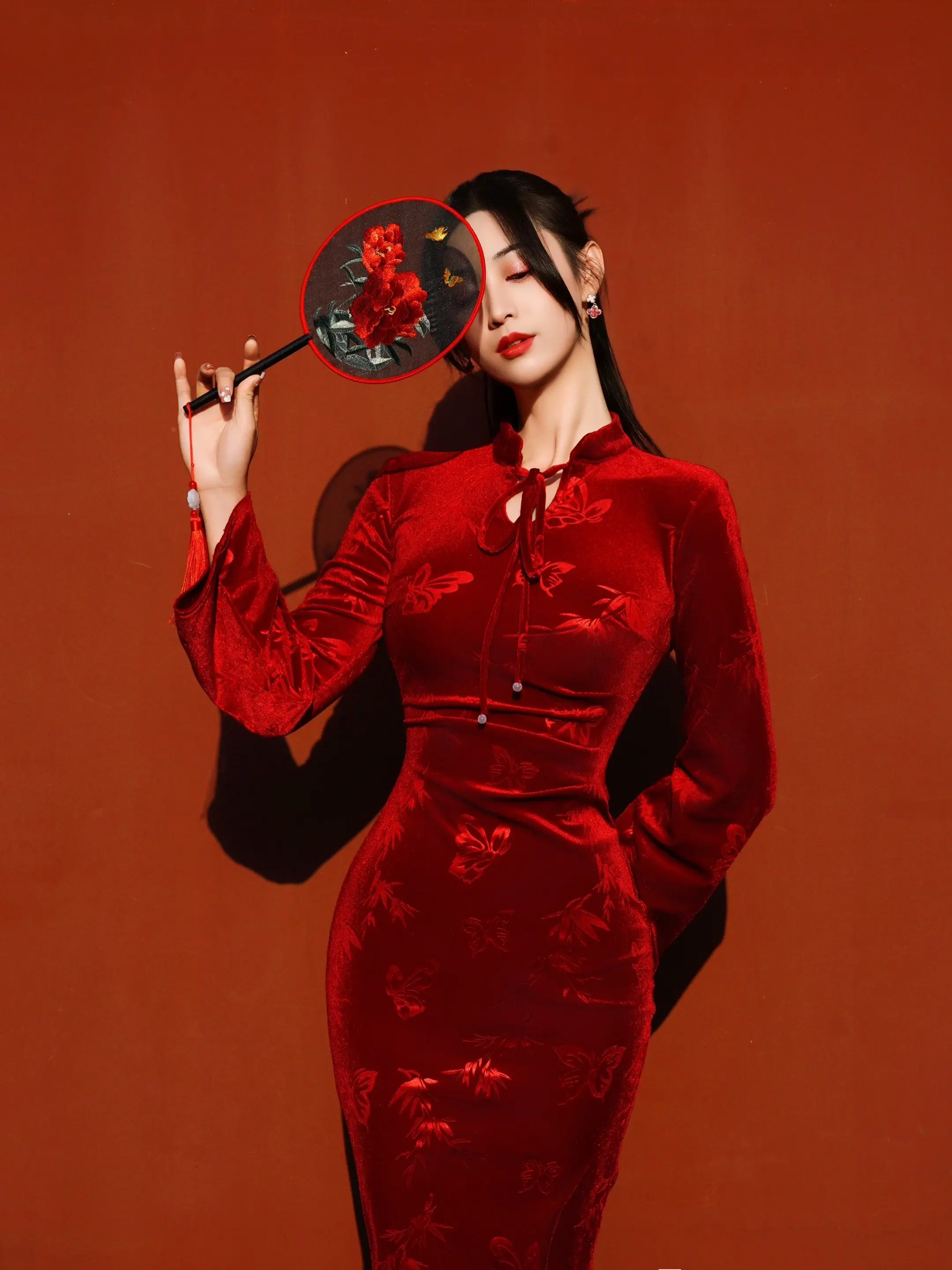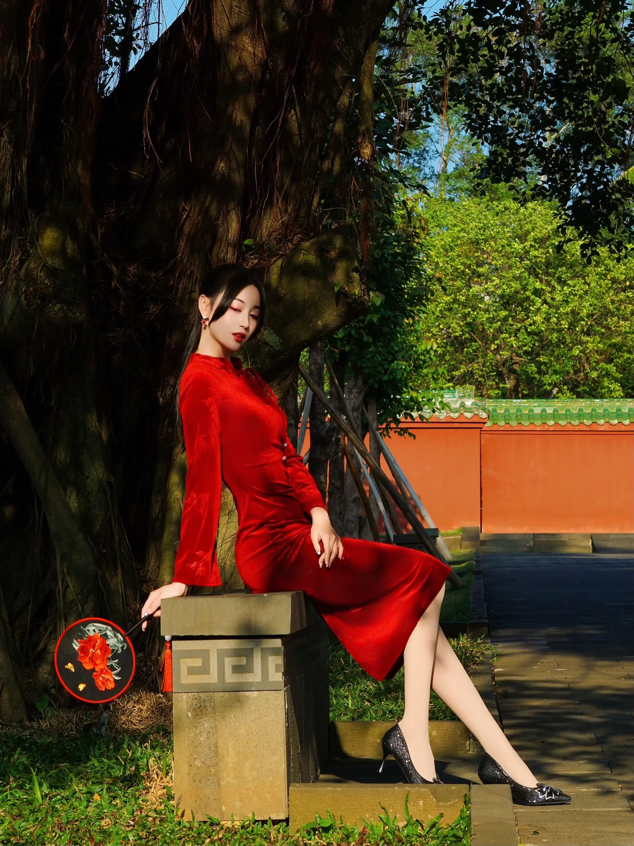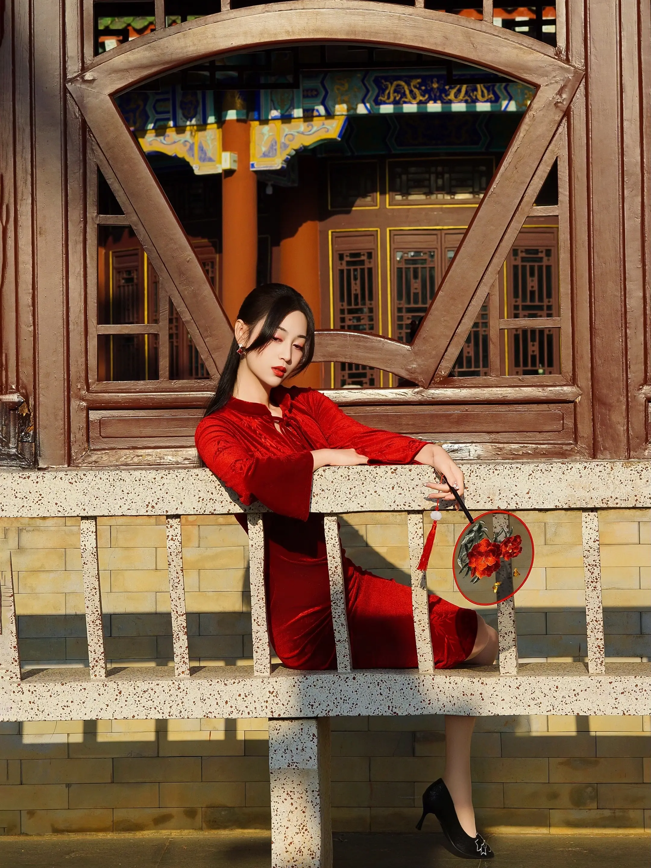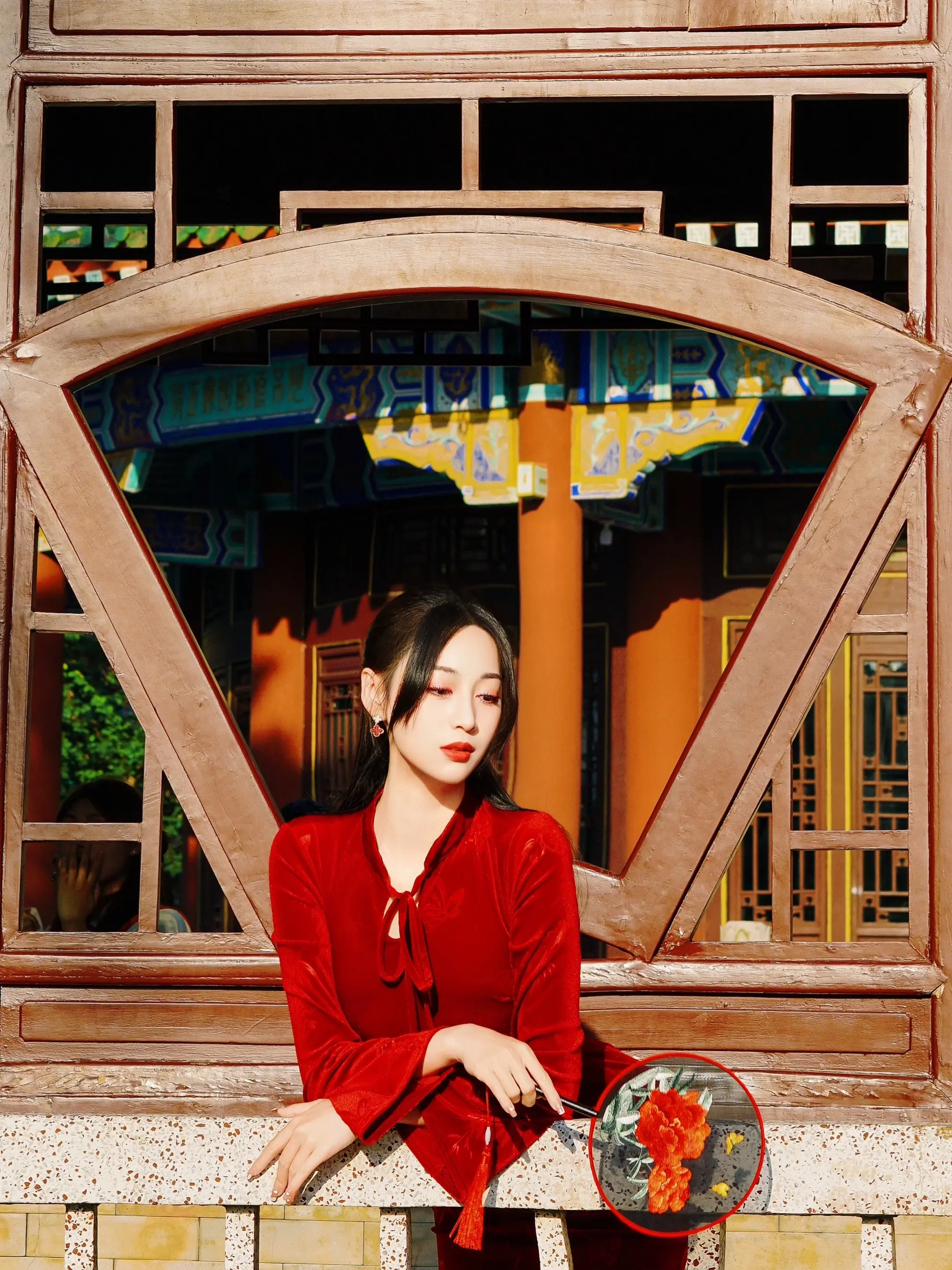 红色迎国庆.华流才是顶流。丝绒缎面 牡丹团扇 新中式 中国红 雍容华贵 端庄 优雅 大方 惹人怜 打卡红墙绿瓦海口小天坛