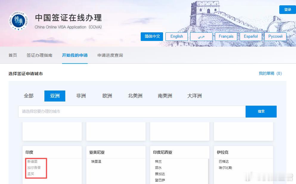 举个例子,在“中国签证在线办理”网站,绝大多数国家都可以直接使用,但是印度的三个城市却都是灰的,意味着用不了,必须到线下面签。