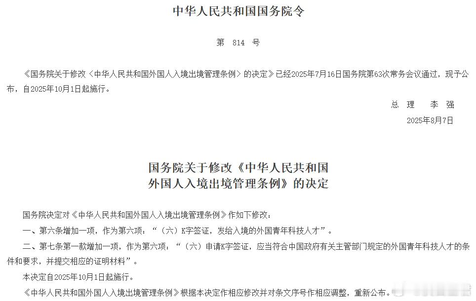 按照今年8月7日公布的第814号国务院令,对《外国人入境出境管理条例》进行修改,新增了一种普通签证,即K字签证,“发给入境的外国青年科技人才”。