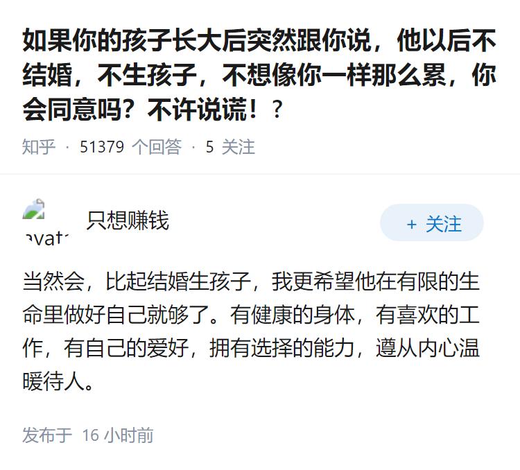 如果你的孩子长大后突然跟你说,他以后不结婚,不生孩子,不想像你一样那么累,你会同意吗?不许说谎!?