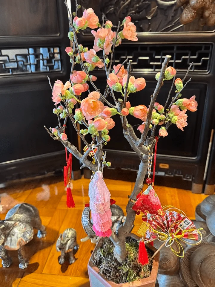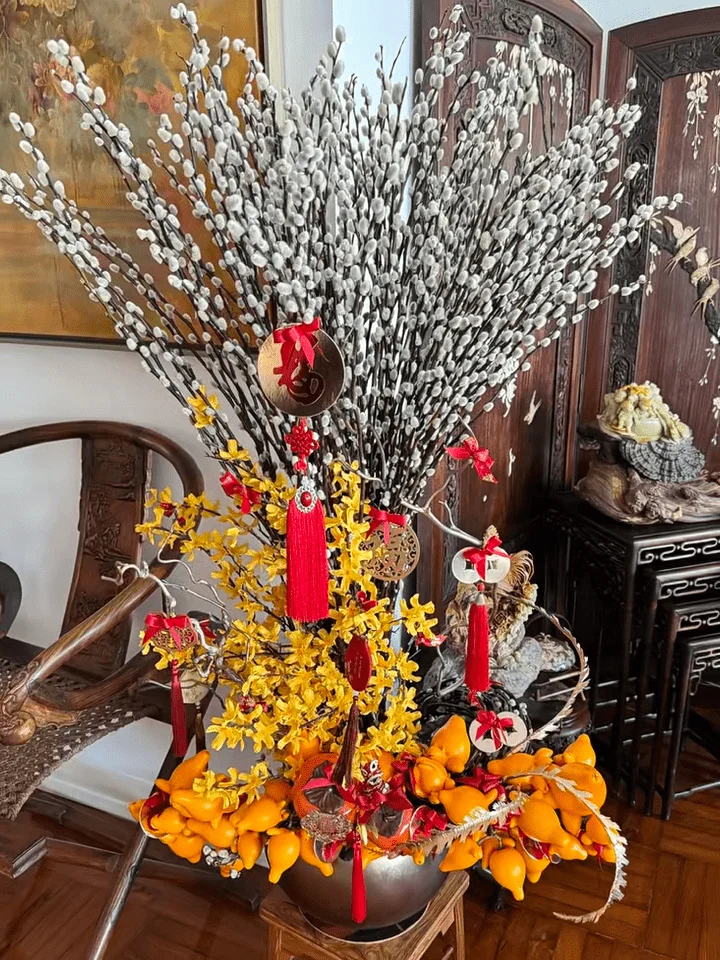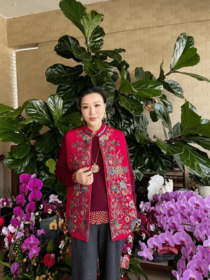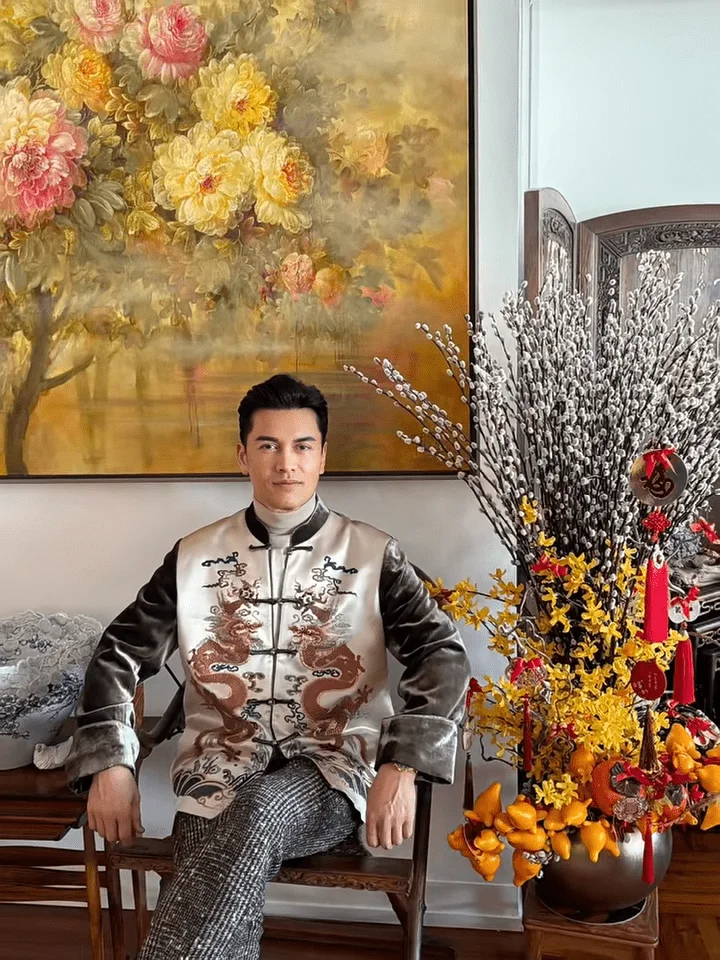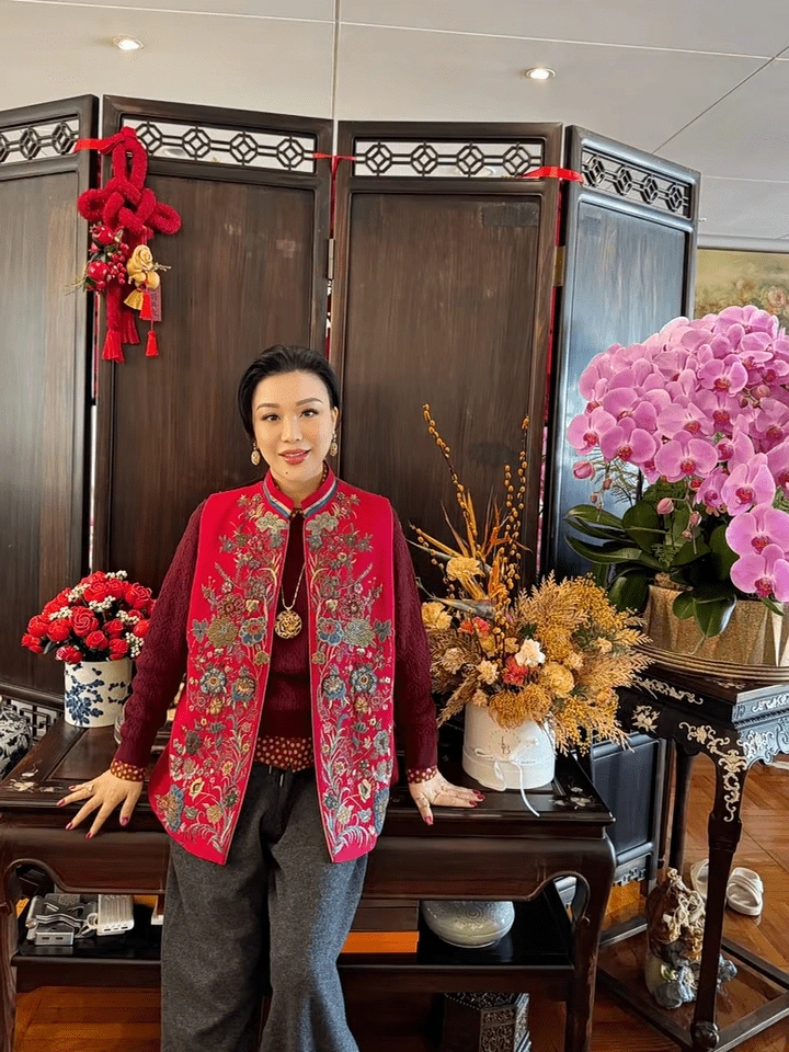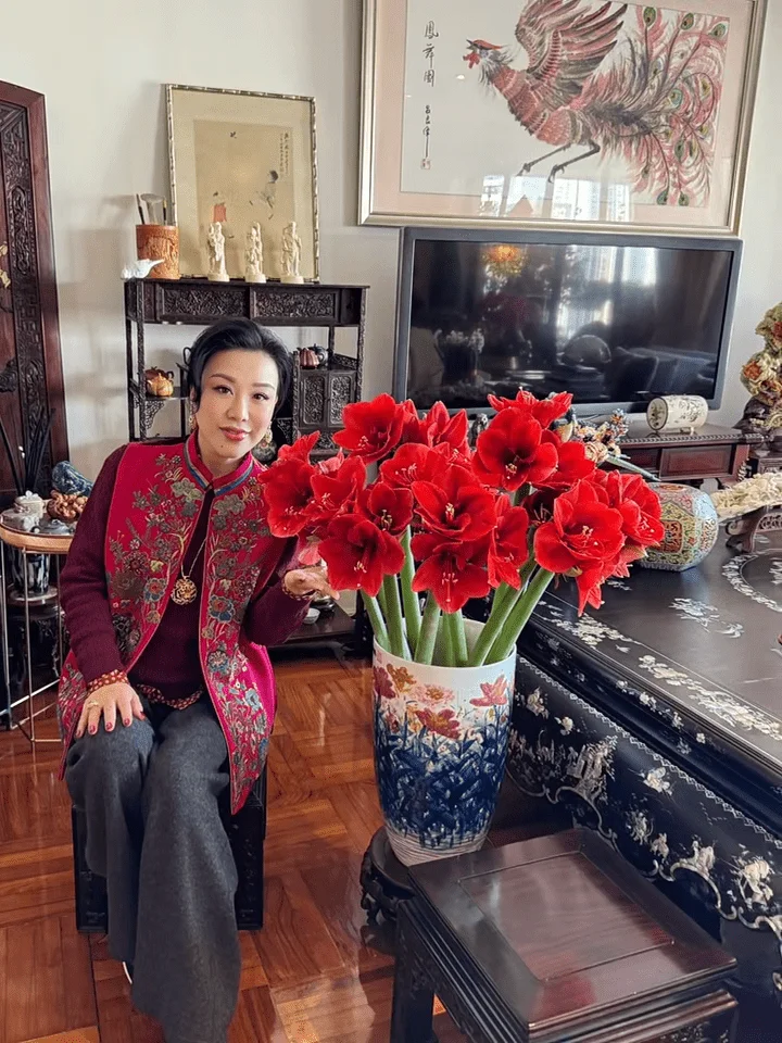 从视频中可以看到,吕良伟与杨小娟的逾千呎豪宅,充满了中式风味。杨小娟身着枣红色上衣搭配桃红色中式长背心和灰色长裤,坐在大厅中赏花,吕良伟则穿上珍珠色的华服坐在中式木椅上打卡,身边放有一盆银柳和五代同堂,而吕良伟身后的白墙挂了一幅巨型牡丹名画,旁边的玄关位更放置设有雕花屏风。