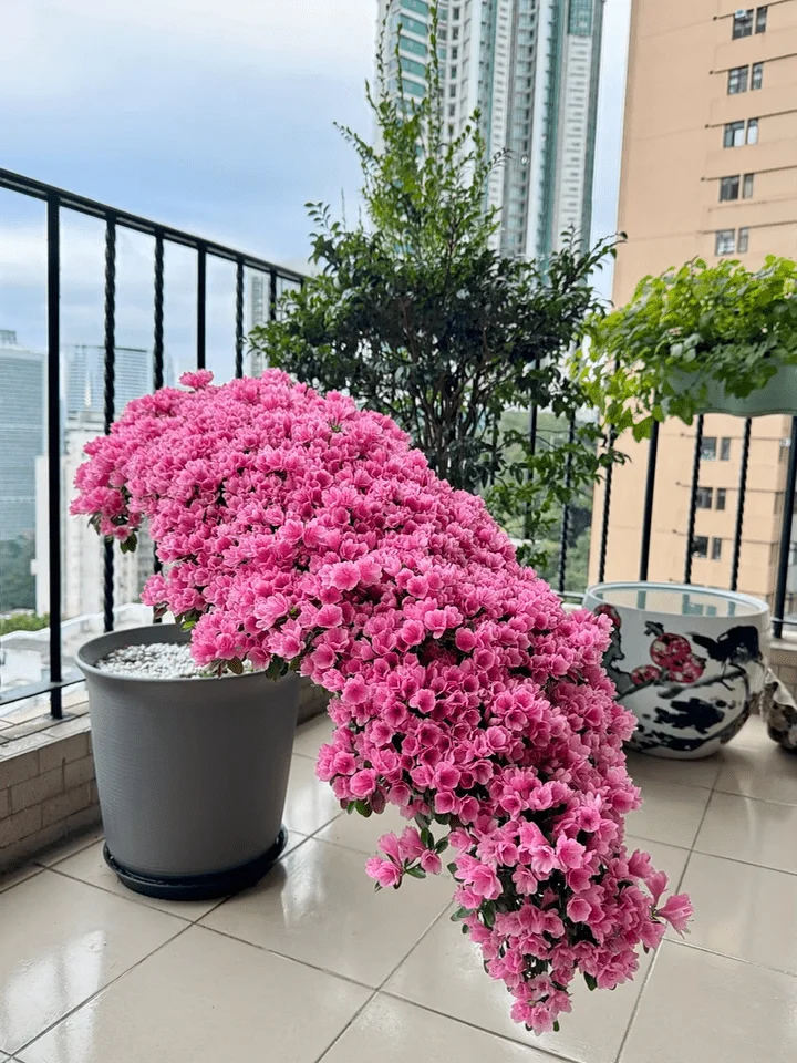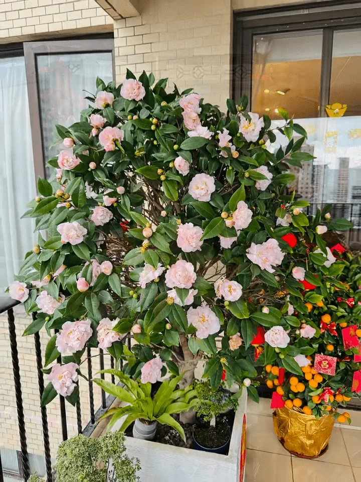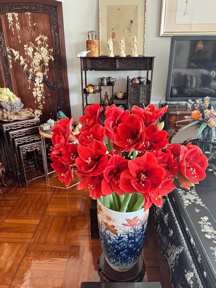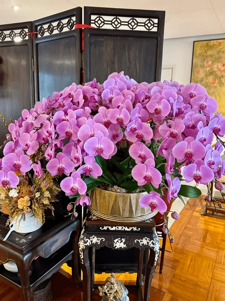 大厅中央摆放了一个具中国色彩的黑色方形木桌,旁边放有一个青花瓷的大花瓶。墙上挂了一幅凤舞图的画作,电视柜和饰物柜都是选用啡色或深色木雕,放有文房四宝及茶具的饰物柜上,更摆放了三个寿星公的陶瓷及一幅小画作,四周更摆放了不少古董及高级摆设,并以各种兰花及朱顶红围绕着,而阔落的露台摆放了两盆兰花、一棵牡丹花,还有其他种类的植物,显得优雅又有格调。