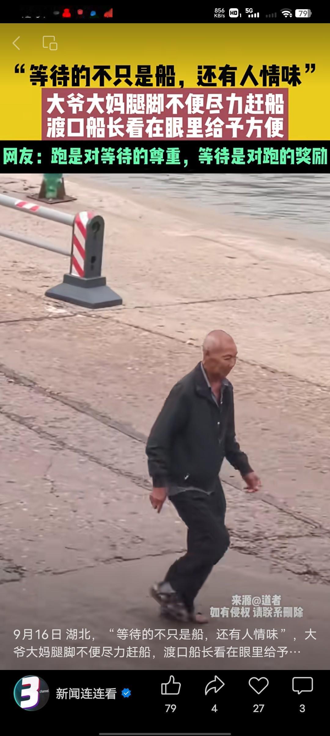 你坐过轮渡吗?你体会过眼看着船要拔锚启航而自己还差几步就能上船的遗憾与登上船的幸福吗? 码头的船已经鸣笛准备拔锚开船,鸣笛是告诉船上的乘客注意要开船了,还有也告诉要乘船的人抓紧时间上船。码头的不远处却有两个脚步急促的老人,一个是在努力的向码头疾走的阿姨,因为从她疾走的样子能看出阿姨的腿脚不方便,阿姨的后面不远还有一位大叔 ,大叔的脚步也不是正常的步伐,他的腿也有残疾。 船长只是鸣笛,却没有开船,依然在等待他们,这时船上所有的人都静默了,没有人催促,也没有人抱怨船长耽误了大家的时间。有人说 ,等待的不只是船,是人情味,奔跑是对等待的尊重,而等待也是对奔跑的奖励。 别人给了你机会你就要抓住,不能浪费了别人的良苦用心,你给别人希望,也要看对方值不值得你真心的付出。假如船长等了,阿姨跟那位叔叔依然慢慢的走,我相信船上的人绝不会任由船长占用他们的时间!这也是相互的尊重吧!