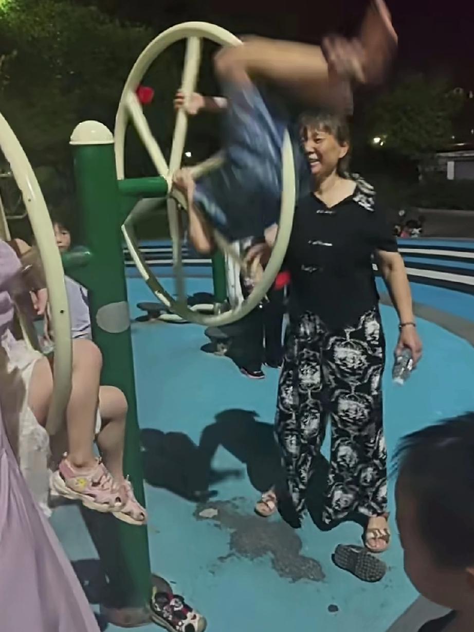 奶奶这样陪孙子玩太危险了!孙子双手抓住轮盘,奶奶则疯狂转动轮盘满脸喜笑,怎么就不动脑子想想,这样玩法孩子不得天旋地转脑袋肯定难受,如果孩子手一松就得甩出几米远去,可想而知轻者摔伤重则没命,有些危险不是没有,而是没想到,所以意外无处不在,这种玩法实在不可取!