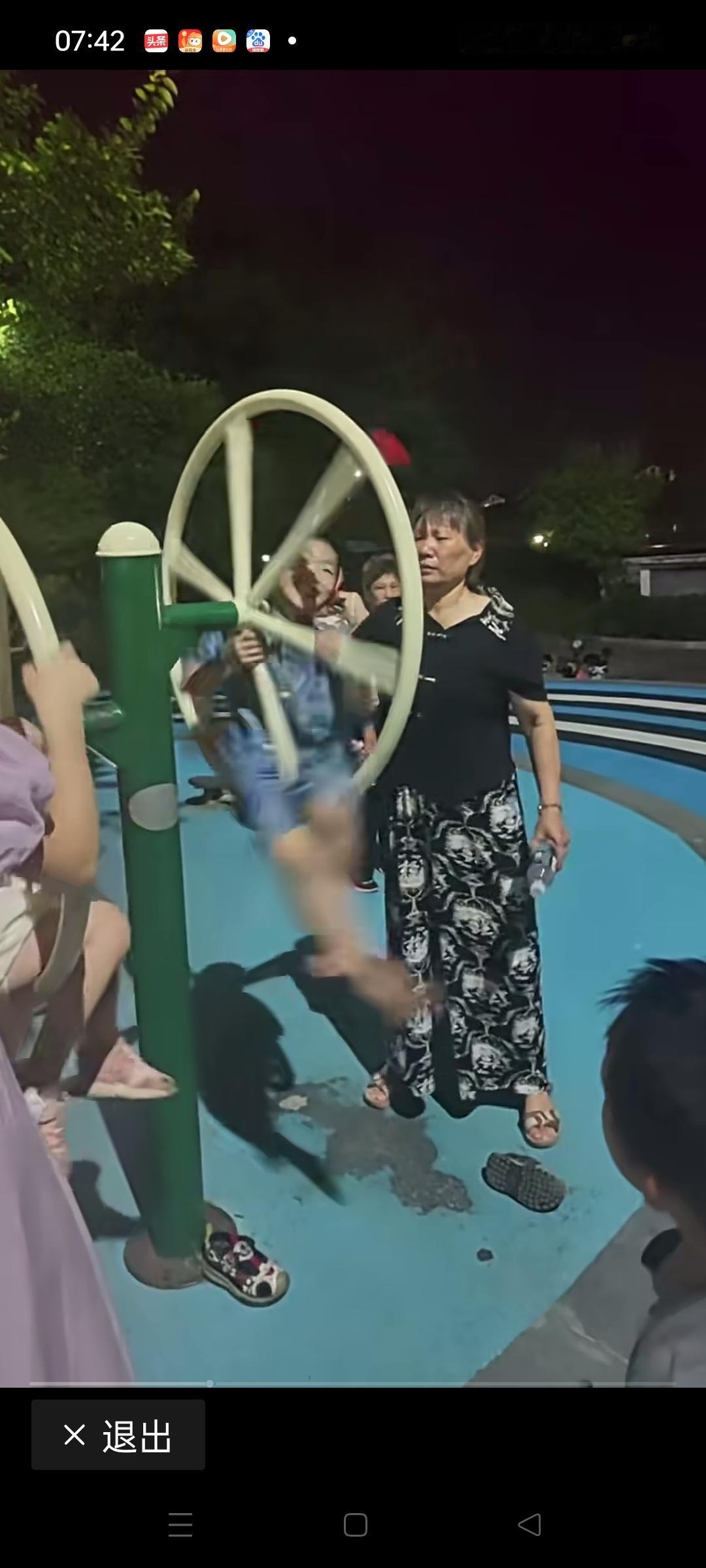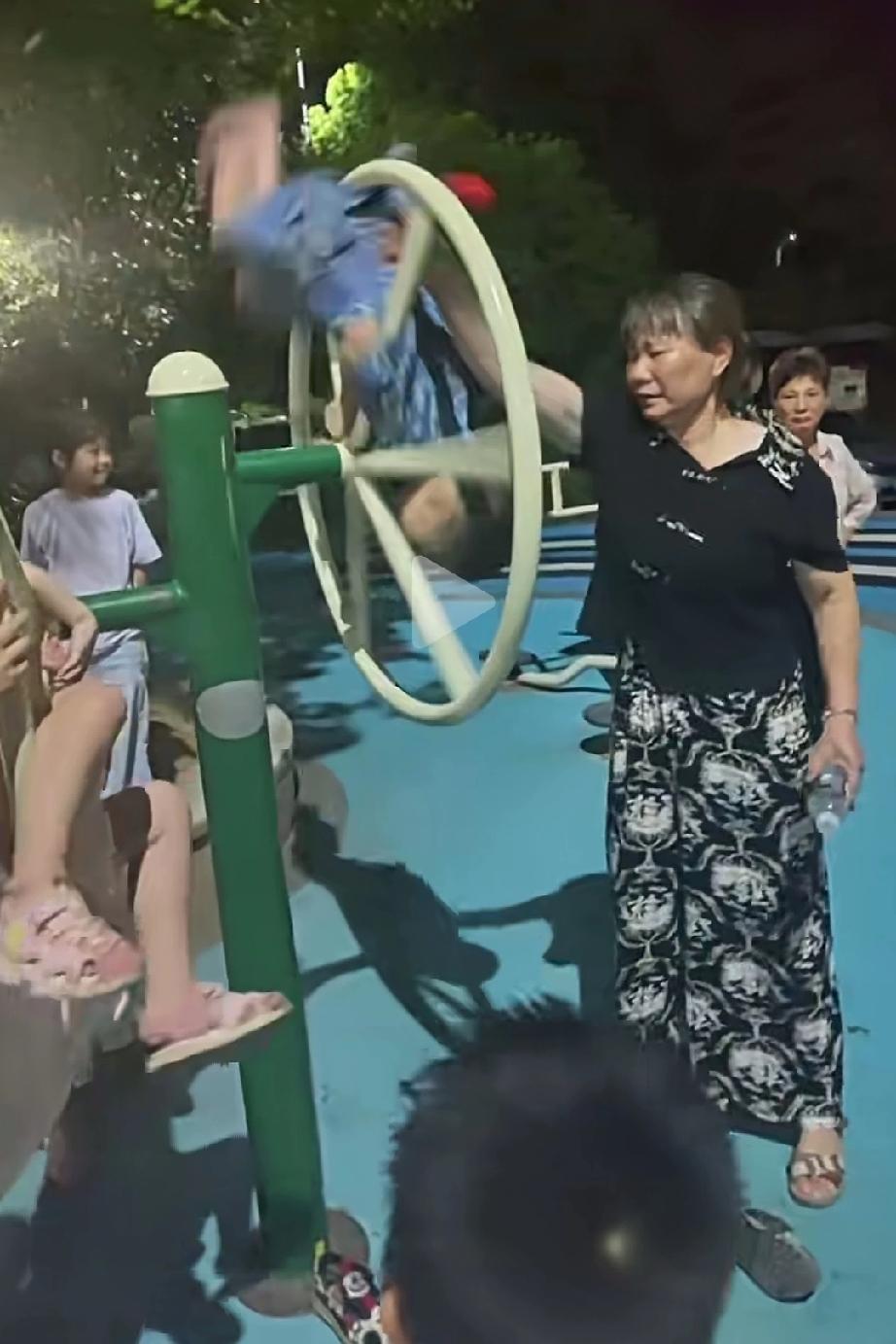 奶奶这样陪孙子玩太危险了!孙子双手抓住轮盘,奶奶则疯狂转动轮盘满脸喜笑,怎么就不