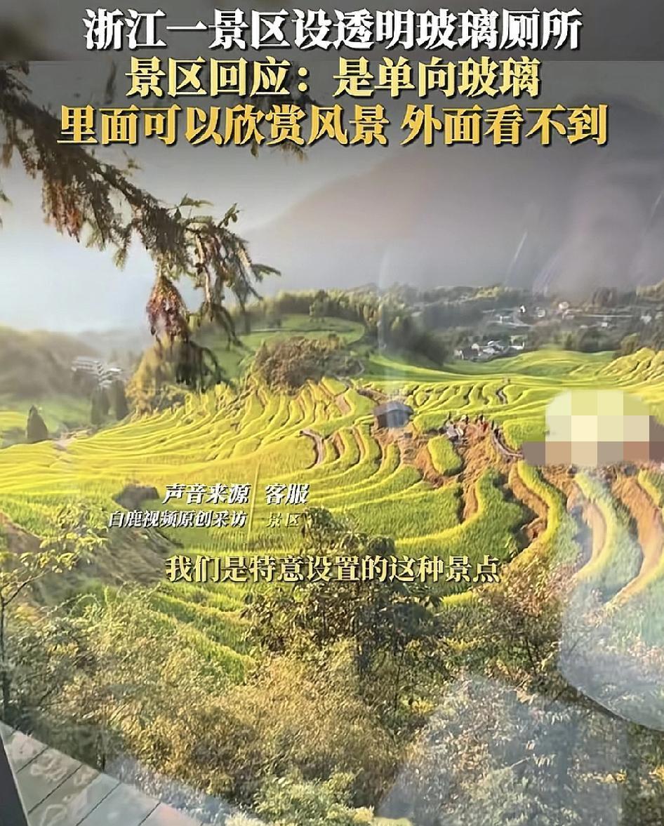 10月2日,浙江丽水有游客反映景区的厕所采用的是玻璃墙面设计,当游客质疑会不会涉及隐私的问题时景区工作人员回应称他们这是网红厕所也是景区特意为游客设定的,但是采用的是单向玻璃,从外面看不到里面,而旅客在使用洗手间的时候可以欣赏外面的风景。这种玻璃的前面在很多景区也采用为的就是给游客一个很特定的体验。