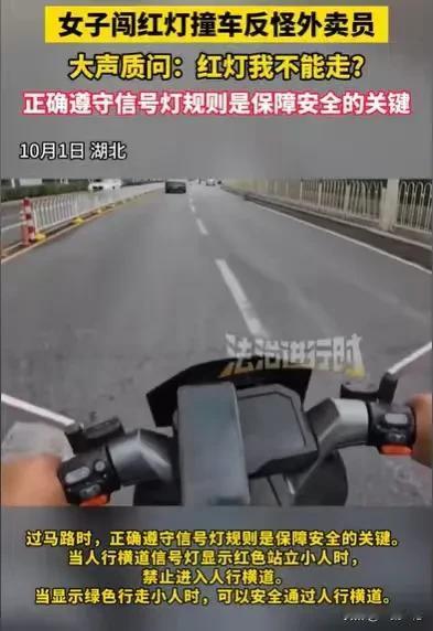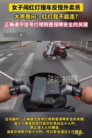 湖北,女子在马路上横冲直撞,根本不看红绿灯,眼看前方无车,一扭油门,就过人行道,结果撞到了从右边过马路的外卖小哥,外卖小哥恼怒地问她:“你没看红灯啊?”不料女子理直气壮地说:“那红灯,没看到啊,红灯,我就不能走吗?我能不能走?” 外卖小哥听到女子这逆天的言论,整个人都感到气愤了,他不知道这女子竟然会如此无理。 就在刚刚,外卖小哥着急送单,毕竟他的送餐时间都是有限的,都需要在规定的时间,把餐送到客户那里,否则就有可能被投诉,被扣钱了,这样真的很难。 但即使再赶时间,他也会遵守交通规则,当他要穿过马路时,只见红灯亮了,他只好着急地等待着。 好不容易等到绿灯亮了,他便一扭油门,赶紧走,因为是绿灯,因为时间比较着急,他就没有太过于关注周围的环境,他只看到前方无人,这个时候,如果大家都遵守交通规则,是不会有意外发生的。 外卖小哥的工作就是穿梭在大街小巷上,他不知道自己已经过了多少次人行道了,也不知道自己有多少次是这么急过马路的,每次匆匆而过,都没有发生过意外。 可这一次,他碰上了,他一扭油门,刚往前没几步,就撞上了一个女子的电动车。 原来这个女子,过马路没有看红绿灯,她看到前方没有车,一扭油门就想闯红灯,结果就撞上了外卖小哥的车。 外卖小哥看到女子是闯红灯,耽误了他的时间,还撞到他,瞬间恼怒地问女子:“你没有看到红灯吗?” 毕竟在当时,女子闯红灯,如果大家的车速再快一点,又相撞得严重,那后果真的不堪设想。 让外卖小哥意外的是,他遇到的竟然是无理女,女子竟然没有半点知错的意思,反而理直气壮地质问外卖小哥:“那红灯我没看到啊,红灯,我就不能走了吗?” 说完之后,她还不罢休,又来了一句:“我能不能走?” 一听这话,外卖小哥气得手都要抖了,女子撞到他,不但没有道歉,还着急着要走。 这一次他们都还算幸运,如果他们相撞得厉害,估计大家都躺在地上等待救援了,谁也走不了了。 现在女子却完全没有意识到,这个问题的存在,遇到这样的女子,外卖小哥怕了。 当时他怕的是,如果公路上多几个这样的无理女子,那交通规则该会乱成什么样了。 他不知道这个女子是不是被父母宠爱长大的,也不知道这个女子是否是被众星捧月,别人都把她捧在手心里的,她就如同一个被惯坏的女子,横冲直撞在马路上。 似乎马路就是她家,她想怎么样就怎么样,红绿灯都是摆设,只要前方无人,她就可以通车,马路上有这样的女子存在,真的太危险了。 是的,这个女子如果没有遵守交通规则,如果长期视红灯而不见,经常闯红灯,那么肯定会发生意外的,这一次是小事故,只是轻微地碰了一下,但下一次谁能保证,她还有那么的幸运呢? 如果她长期闯红灯,她不幸运,这是必然的,但是别人呢,和她相撞的人就倒霉了,不但有可能受伤,还有可能要赔偿。 不遵守交通规则,不看红绿灯,这真是害人害己。 外卖小哥看着着急要走的女子,他真的很希望女子能够吸取教训,不要视红灯而不见,不要闯红灯了,否则真的会发生严重的意外。 那么如何认定女子闯红灯的行为呢? 首先,不管女子是开车还是走路,她都不能闯红灯。 《道路交通安全法》第90条规定:机动车驾驶人违反道路交通安全法律、法规关于道路通行规定的,处警告或者二十元以上二百元以下罚款。 闯红灯作为违反道路通行规定的行为之一,将受到此条款的处罚。 其次,发生这一次事故,是女子有错在先,外卖小哥是正常行驶,女子是闯红灯行驶,因此发生的所有损害都应当由女子来承担。 《民法典》第1165条规定:行为人因过错侵害他人民事权益造成损害的,应当承担侵权责任。 因此在这一次事故中,如果外卖小哥的车受到损害,或者送餐延迟受到的损失,都可以要求女子赔偿。 那你对女子的行为有何看法呢?