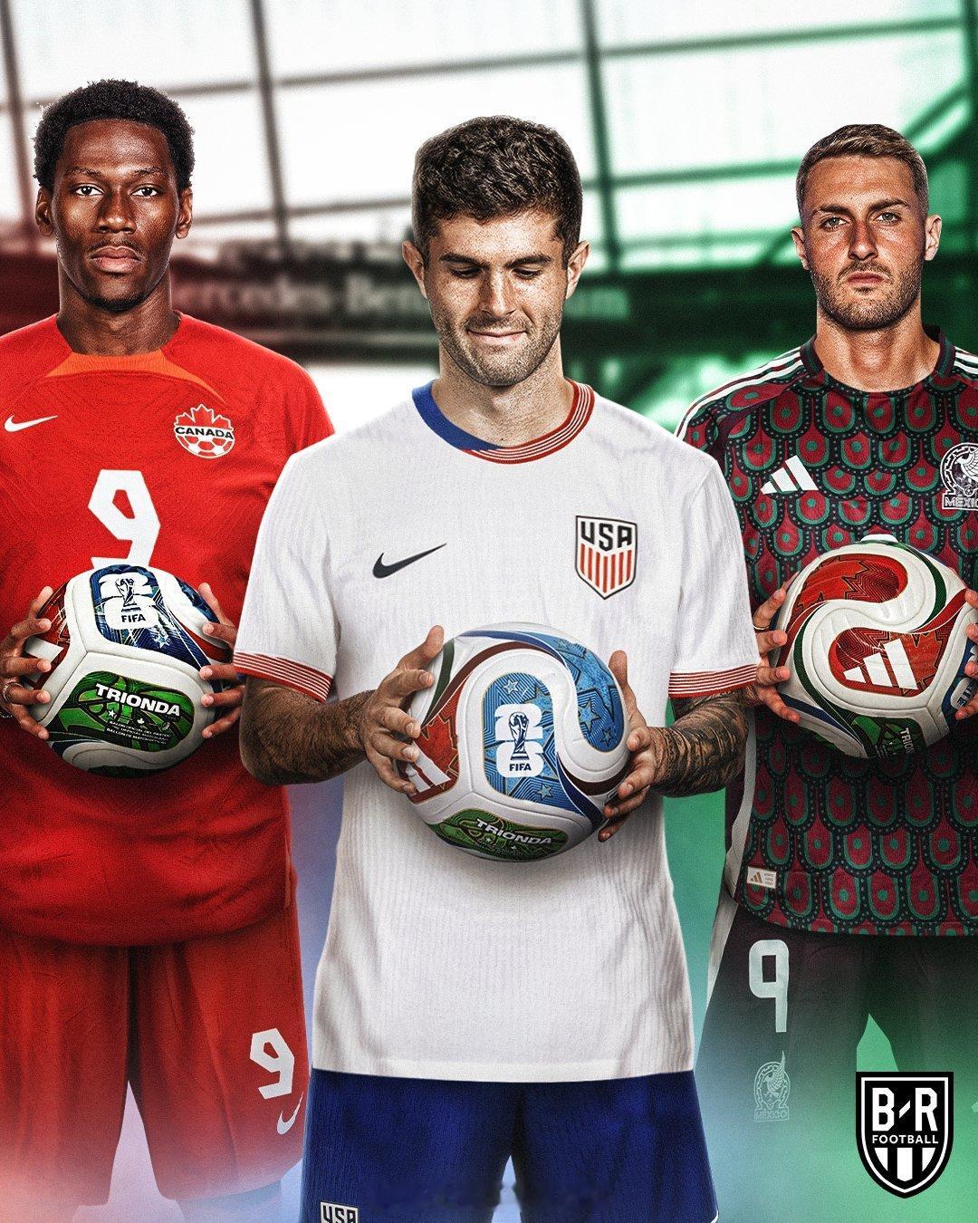 蓝色星星图案(美国)搭配世界杯LOGO,红色枫叶图案(加拿大)搭配阿迪达斯LOGO,,绿色雄鹰图案(墨西哥)搭配“Trionda”LOGO。
