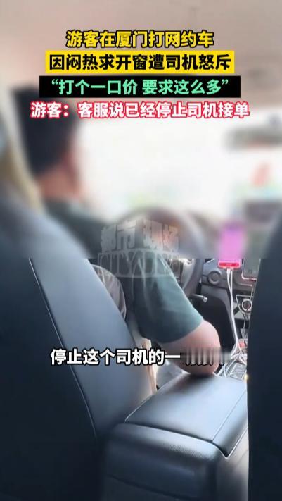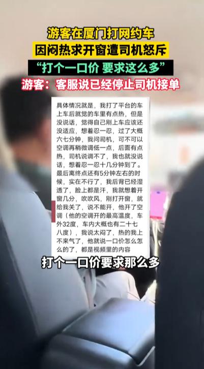“必须严惩!”10月2日,福建厦门,一男子到当地旅游时叫了辆网约车,途中因为车内闷热想打开车窗,没想到竟然被司机怒斥,称男子打个一口价要求还这么多,网友:这个司机也是个狠人,宁愿和乘客一起热! 现在正值十一长假,各地都迎来了大量游客,不少人到了当地后都会选择乘坐网约车出行,可某些网约车司机的行为确实有些过分,这很有可能导致坐车的乘客对当地留下不好的印象。 一名男子出门旅游,当天天气炎热,气温高达32℃,他选择叫了一辆网约车出行,刚上车时男子就感觉到有些热,他以为适应一会就好了,车子开了一会后,男子还是感觉有些热,便请求司机将空调调低些,司机想都没想就说调不了。 男子心想就十几分钟的路程,忍忍就过去了,快到目的地时男子的后背已经有些被汗水洇湿了,就顺手将车窗打开,谁知,司机居然强行将车窗关闭,随后开始指责男子,态度极其恶劣,称他打个一口价事还这么多。 面对司机恶劣的态度,男子解释道自己热得不行了,司机直接来了句“不行就死”,这可把男子气得不行,下车后立马拨通了网约车平台的电话,客服调取了当时车内的录音后,停止这名司机接单。 不少网友表示司机此举真的有些过分了,既然决定做这一行,就得履行网约车司机的职责,将自己的情绪发泄到乘客身上属实不应该,这种人必须严惩! 信息来源:《游客在厦门打网约车,因闷热求开窗遭司机怒斥,“打个一口价,要求这么多”,游客:客服说已经停止》江西都市现场
