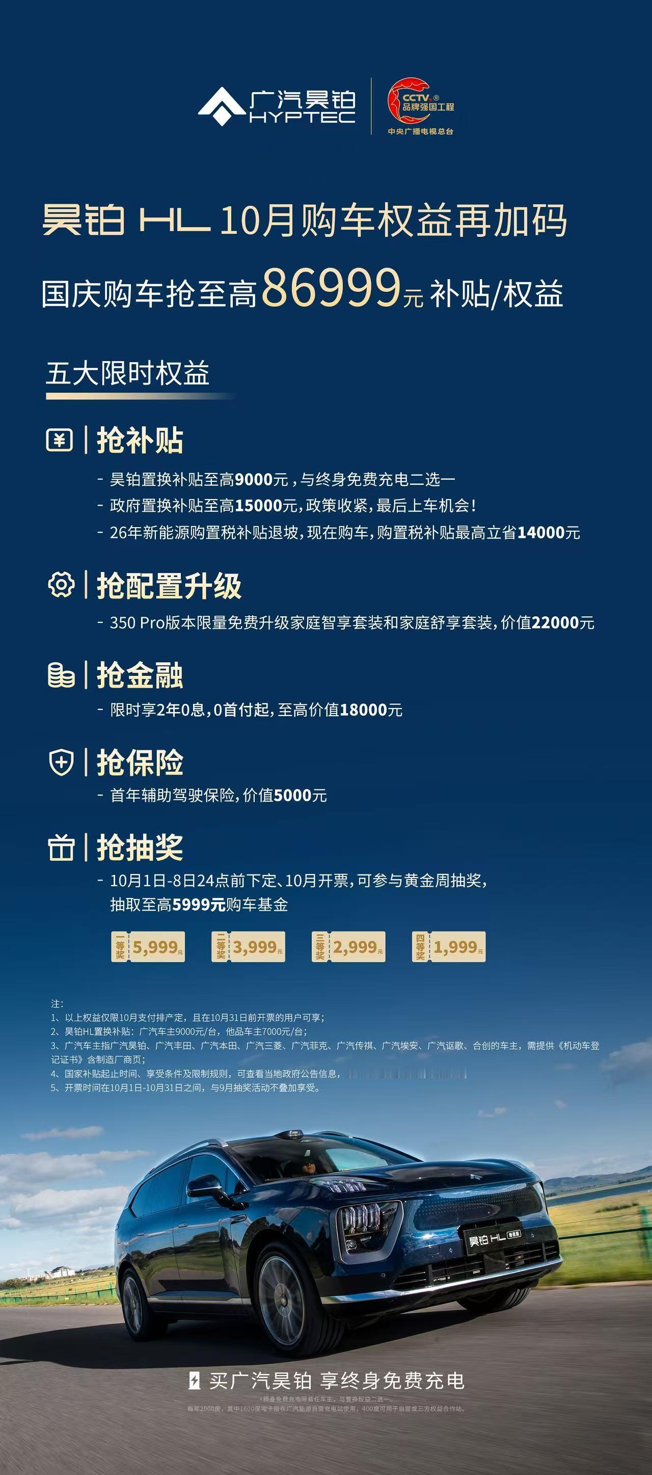 门店和地方车展都逛了下,国庆看广汽昊铂HL的人挺多的,都是想买个大SUV发现这车配置很高,别的车加钱的配置,像是智驾、激光雷达、零重力座椅这些,HL增程版要么标配要么限时送,问了一下,入门版10月送冰箱、彩电、Nappa真皮大沙发,国庆期间还有抽奖,相当于有2千-6千优惠,政策力度是够了的。