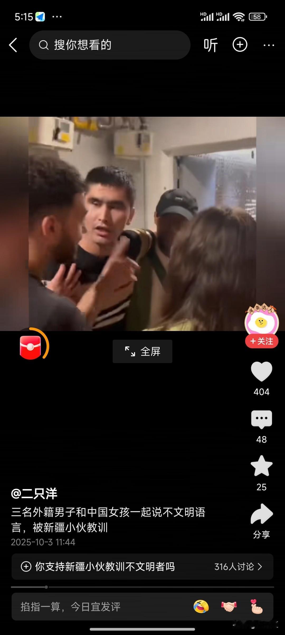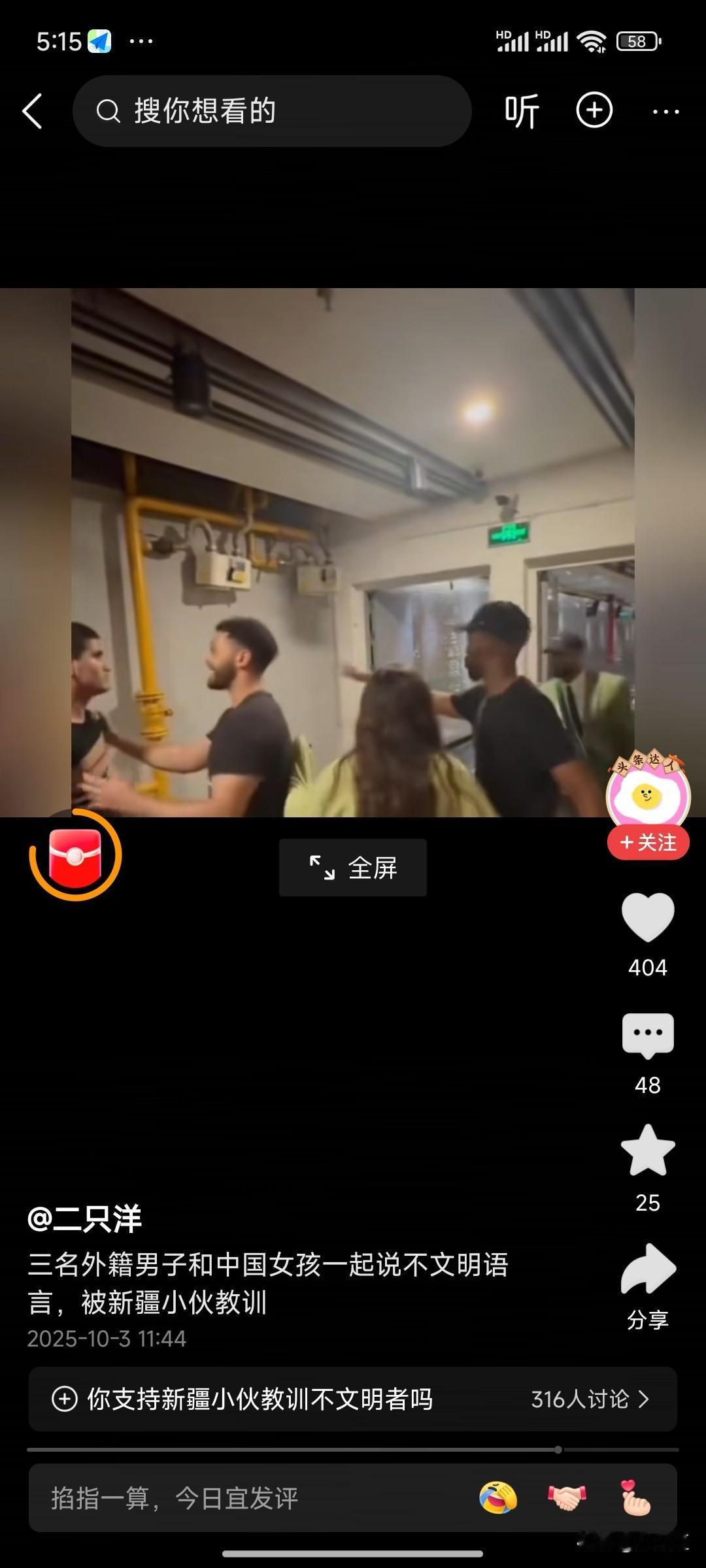 新疆小伙怒怼外国人! 刚从头条上看了一个视频,很短,内容是几个外国人和一个中国女孩(我个人表示怀疑,也不认可其是女孩,但视频配文是中国女孩),说一些不是很文明的话,女孩生没生气我不清楚,但边上一个新疆男孩看不下去了,仗义执言,怒怼老外,告诉老外这是中国。 事不大,但关乎国格,这些人大概率是留学生,而且很有可能奖学金全覆盖,对教你知识的国家,给你饭吃的国家应该有一个最起码的尊重! 至于新疆男孩的行为,大家都是中华民族,做了应该做的,不多说,一句话:好样的!