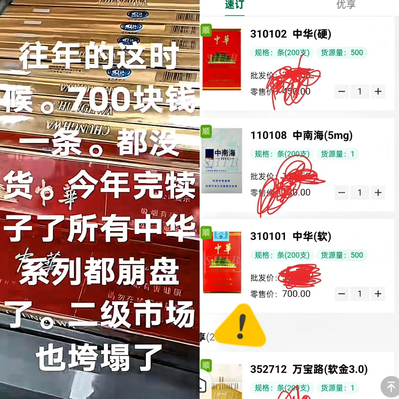 上海烟草放大招,商户叫苦不迭。 现在的软硬华子市场泛滥成灾,价格暴跌!谁能想到软华子 能惨到这份上?以前零售70一包多有面儿,现在500一条堆着都没人要; 硬华子更别提了,45零售的款,350一条都找不到买主。 说到底还是上海烟草这波操作太急了!每家商户硬塞1000条软硬华子,这哪是供货,简直是往商户手里塞“烫手山芋”。 只顾着自己放量赚钱,完全不管商户卖不卖得动,把华子的品牌溢价和老商户的信任全砸没了——商户压着货周转不开,不想抛弃都难! 你们身边现在华子价格有没有跳水?开烟酒店的朋友有没有吐槽过这情况? 华子价格波动 华子价格 华子停货 上海游烟 华子困局 21根烟 尅根烟 上海水烟 中低档香烟为啥越来越紧缺?