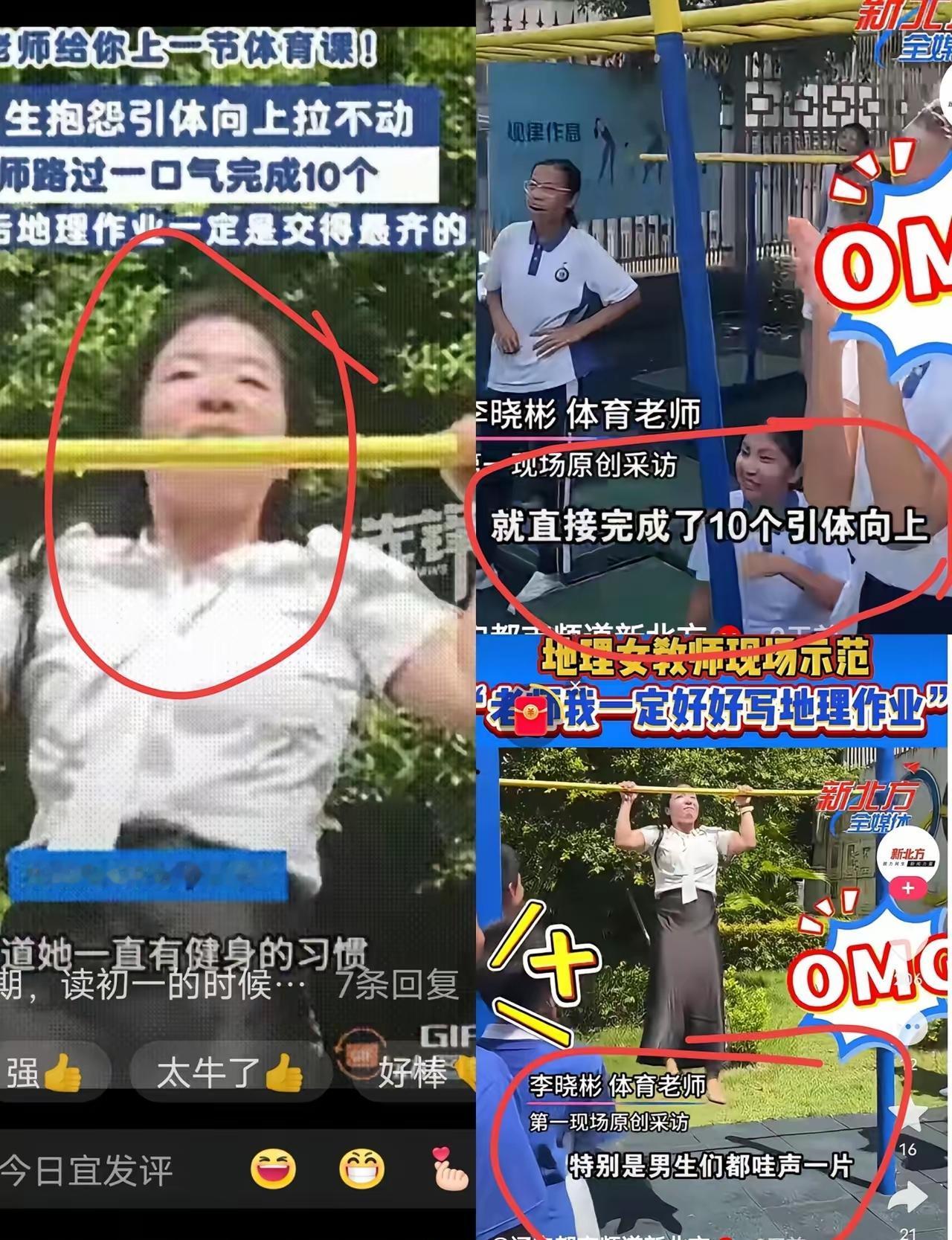 这下瞒不住了,不仅学生知道了, 老师家长都知道了! 深圳某中学的体育课上,单杠旁围满了犯难的学生,有人攥着杠子试了两下就往下滑,有人干脆直接摆手:“这引体向上根本不可能!手酸得使不上劲!” 吵嚷声刚好被路过的地理老师听见,她放下手里的教案,笑着凑过去:“真有这么难?我来试试。” 话音刚落,老师撸起校服袖子,双手稳稳握住单杠,双脚轻轻离地。下一秒手臂发力,身体顺着力量自然向上,动作标准又流畅,没有丝毫勉强。学生们瞬间安静下来,眼睛紧紧盯着单杠,数着“1、2、3……” 直到第十个做完,老师落地时气息都没乱,还拍了拍手上的灰:“平时多练,你们比我做得还好。” 现场瞬间炸了锅,体育老师带头鼓掌,学生们围着老师追问:“老师你练了多久啊?”“有没有简单的锻炼方法?” 其实哪有什么“天赋”,能轻松完成引体向上,不过是老师多年坚持锻炼的结果——可能是每天早起半小时跳绳,可能是周末抽时间去健身,把别人刷手机的功夫,用在了实打实的运动上。 这事儿最打动人的,从来不是“老师会做引体向上”,而是她用行动告诉学生:别总说“我不行”,很多时候“难”只是没开始的借口。比起课堂上的知识点,这种“看得见的坚持”更能让学生记在心里。