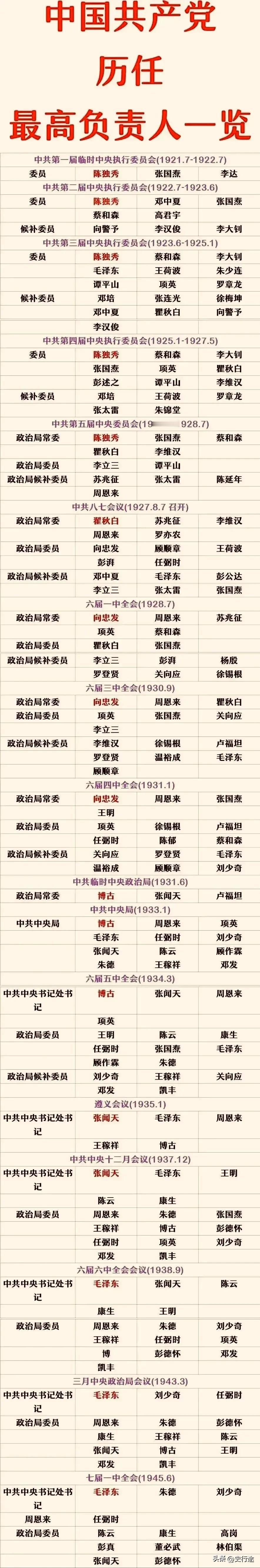 第一任:陈独秀领导; 第二任:瞿秋白领导; 第六任:毛主席领导; 这是我们党历史上的历任最高领导人们,前后共经历了六位最高负责人,先是陈独秀领导,他也是我们党成立的创始人之一。在我党成立初期,经历了艰苦卓绝的斗争,直到1938年,才真正迎来了毛主席的领导,从此走向光明。 1937年夏天,卢沟桥那边一声枪响,全国抗战开始了。 局面一下子变了,国共两党又走到了一起,说是合作,其实彼此都捏着劲儿。蒋介石不想让共产党做大,共产党这边也不准备把命运交出去。 就在这年冬天,王明回来了。 他在苏联待了好几年,见过不少人,说话也带着点口气。他一回来就开会,说要一切都通过统一战线,八路军也得听蒋介石指挥。 坐在下面的人,有点懵,也有点摇摆。 毕竟他刚见过斯大林,说的话让人不敢马上否。 但毛主席没跟着点头。 他记得大革命失败的那几年,记得1927年后党的转折,也看过蒋介石的路数。他不信国民党真愿意平等合作。日本打得是猛,但大多集中在城市和交通要道,中国地方大,农村多,反而成了共产党活动的空间。他说要靠游击战,在敌后扎根。 这事,他反复讲过,不是一次两次。 延安开会的时候,有人听王明说得像有理。统一战线、民族团结,这些词谁不认?但要真把八路军交出去,谁来保证不被边缘化?毛主席没直接怼人,他只是一遍遍讲要独立自主,要靠自己组织根据地,自己打仗,不靠别人施舍。 王明去了武汉,挂了不少头衔,在那边搞工作。 但他那套想法,慢慢出问题了。 蒋介石那边没真拿他当回事,党内这边也越来越觉得他跟中央有点不贴。 1938年春,党派任弼时去莫斯科,他带了个报告,把国内抗战局势讲了一通。 几个月后,共产国际回话了,说中国共产党的政治路线没错,说灵活,说实事求是。这就像是打了一针强心剂,延安这边松了口气。 更直接的是季米特洛夫说的话。他告诉王稼祥,毛主席应该当党的领导,其他人别争。 这不是命令,但在当时,就算半句暗示也够用了。王稼祥把话带回来,九月政治局开会的时候,讲了出来。 会场不热闹,但没人反驳,大家心里都明白,风向变了。 到了9月底,党的六届六中全会在延安开的。 会址是个老天主堂,地方不大,屋里能坐几十号人。毛主席在会上作了报告,讲抗战进入相持阶段以后,党该怎么走。 他没用太多空话,也没绕圈子。他说统一战线要坚持,但得守住独立,不能事事都看人眼色。 他还讲了一个提法——马克思主义中国化。意思是不能死搬书本,要根据中国自己的情况来办事。过去搞斗争,是根据工人城市那一套,现在不行了,得看农村,得看敌后。 这种话,在当时并不新鲜,但他讲得更直白,也更有底气。 会上的另一个重点,是党的纪律。他说得很清楚:个人服从组织,少数服从多数,下级服从上级,全党服从中央。 几句话,后来被写进党章。 当时不是喊口号,是为了管住那些各搞一套的干部。张国焘当年那一出,党到现在都没完全缓过来。 毛主席还特意讲了游击战。他说,正规战是主力,但没游击战,就站不住。 现在八路军和新四军大多在敌后,那些地方条件苦,但空间大,能发展。他警惕有人轻视游击战,把希望都压在正面战场上。他说那样会被动,会被卡住。 他还提到“一切经过统一战线”这个说法,说不对。他的原话是,这么说,就是一头扎进人家框子里。国民党不可能让统一战线有真正的组织形式,形式都没有,还谈什么事事经过?底下的人听懂了,没人再拿那个口号当回事。 会议最后,党通过了几份文件,定了不少规矩。 比如中央委员不能在外面乱说话,不能发和中央不一致的意见。地方上也不能自作主张,得服从中央。这些规矩,没什么新鲜字眼,但很实用,能管事。 全会之后,毛主席的领导地位基本稳住了。 没人再去争,也没人敢公然唱反调。王明的影响力往后退了,虽然名义上还在核心层,但已经边缘化。新四军、八路军在各地扩展,根据地一块接一块地铺出来。群众开始参与,党内气氛也稳了下来。 蒋介石那边,看在眼里,不高兴,但也不好下手。 共产党现在有了根据地,有了兵,有了人,有了地盘。统一战线表面上还在,但底下的博弈越发复杂了。 1938年冬,天主堂院子里照了一张相。 前排几个人坐着,毛主席在中间,神情淡。旁边是朱德、王稼祥、项英、王明。后排站着刘少奇、周恩来、彭德怀,穿得不整齐,神态各异。 那天没风,但天冷,地上有点霜。相机咔哒一下,就把那个节点留住了。 那天以后,很多事情悄悄变了。