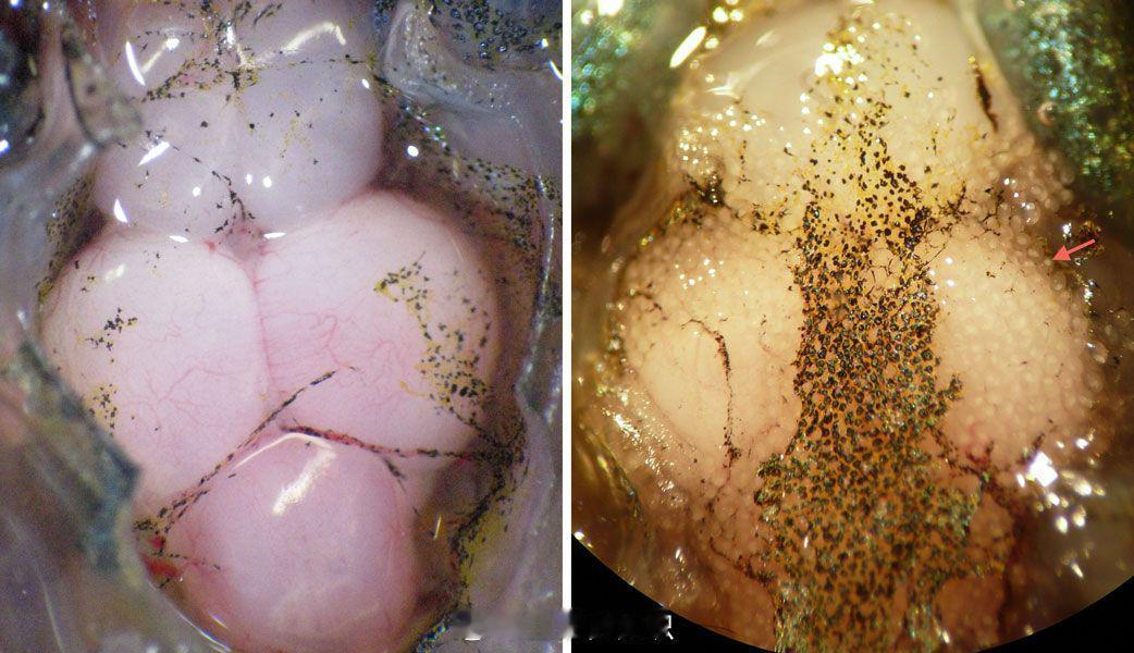 健康(左)和寄生虫感染(右)杀伤的鱼的大脑。该寄生虫称为Euhaplorchis