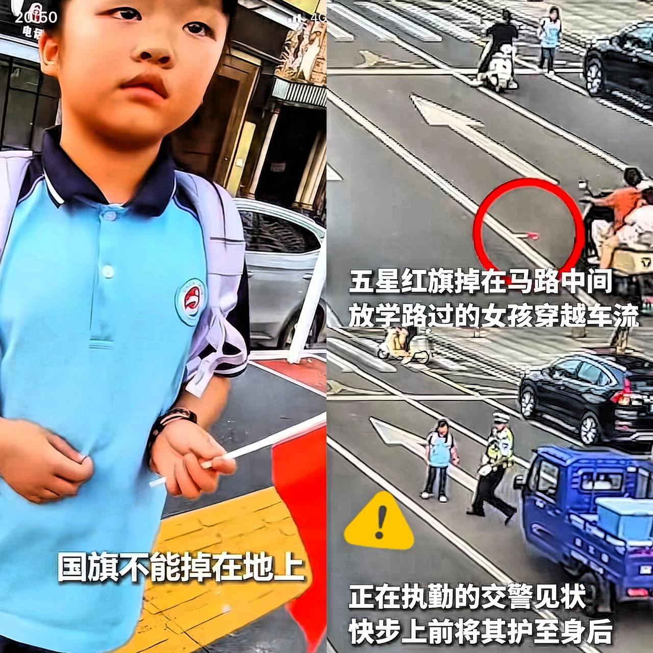 大声告诉我,女孩的做法帅不帅? 近日,一则视频感动全网! 放学途中,小女孩看到马路中央有一面国旗掉在地上,她不管车流就往跟前冲! 别觉得这是小孩冒失,她蹲那儿捡旗时说的“国旗不能掉地上”,比啥豪言壮语都戳人! 刚好交警叔叔看见了,立马跑过去挡在车流前护着她,这画面看着就热乎! 一边是孩子拼着劲护国旗,一边是大人拼着劲护孩子,哪是单向的感动,明明是双向的暖心! 咱都知道,烈士们当年连命都能豁出去,就为护住这面旗,咱现在的安稳日子,全是这面旗背后的热血换的。 这孩子没讲大道理,可她的动作、她的话,把对国旗的敬畏装得满满当当。 不是说这孩子将来一定得成“栋梁”,而是这份从小就有的赤诚,比啥都金贵。 你们小时候有没有过特别在乎国旗的小举动?小姑娘爱国 女孩路过点赞 扛标旗女孩 小女孩标旗 我是爱国小女孩 捡国旗女孩 敬礼小女孩
