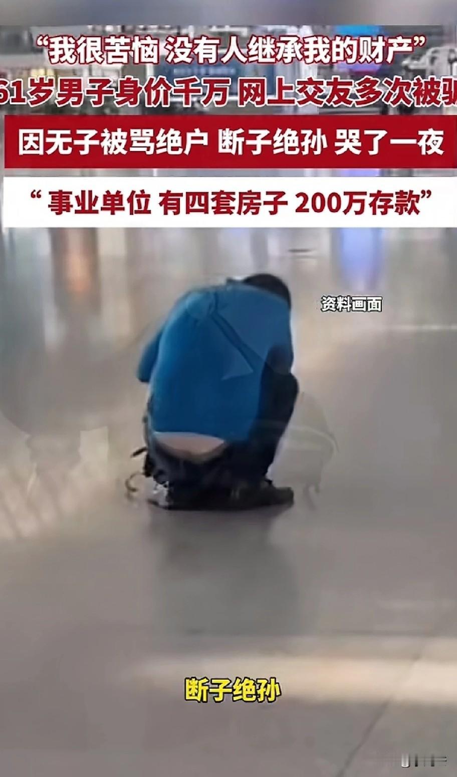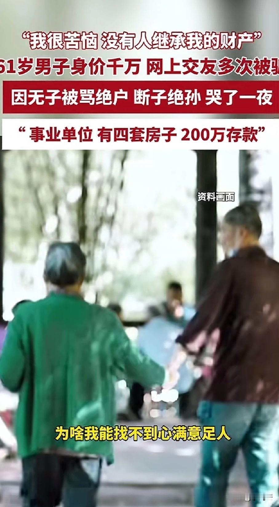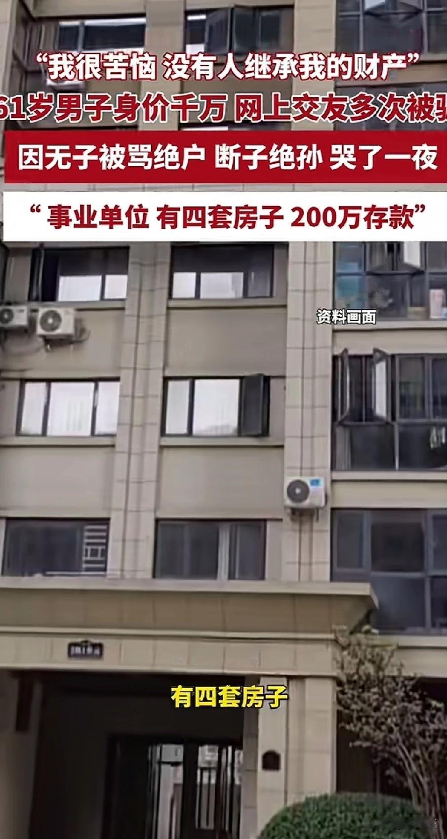 61岁的张先生哭诉,事业单位干了一辈子,攒了四套房,200万的存款,其中还有一套房在深圳。没想到60岁的千万身家,却无人继承,网上交友被骗钱,甚至有人跑他家祖坟骂他“绝户”! 真的是穷人有穷人的心酸,富人有富人的苦恼。张先生坦言自己条件不错,人人羡慕的事业编,工作稳定体面,自己没有不良嗜好。 工作多年,攒下了四套房,积蓄也有将近200万,衣食无忧。他很纳闷,自己不错的条件,却蹉跎到了60岁都没有自己的孩子。 年轻时也有过一段婚姻,只不过很快就结束了,两人没有孩子。此后,他又经过各种相亲恋爱都没能结婚,不甘心的他甚至还在网上交友,最后还被骗财。 他说,老家的人甚至跑到他家宅基地上躺着骂他绝户,无儿无女继承家业。这令他十分伤心,破防大哭,想找一个心满意足的人继承自己的财产怎么这么难! 有人说60岁还能攒下这个家业,后半辈子不用愁,就已经很不错,不一定非要强求子女,干了一辈子没必要都留给孩子,孩子也不一定会珍惜,该享受享受! 也有人认为人的一辈子,有再多钱,没有家人也是失败的,人的一辈子就图个万家灯火,有家人才会归宿,再多的钱不如有个亲人重要! 对此,你怎么看?