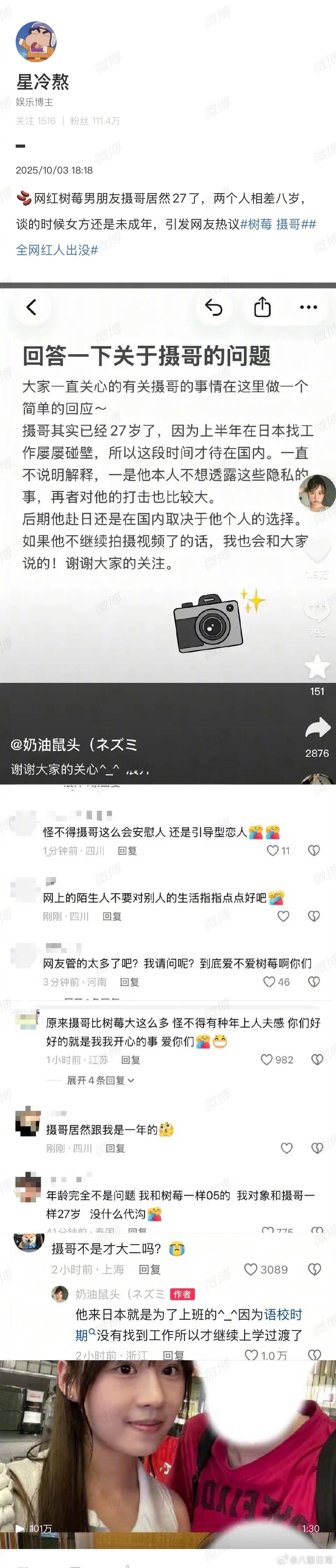 树莓发文回应,表示跟男朋友摄哥在一起的时候自己已经成年了树莓摄哥