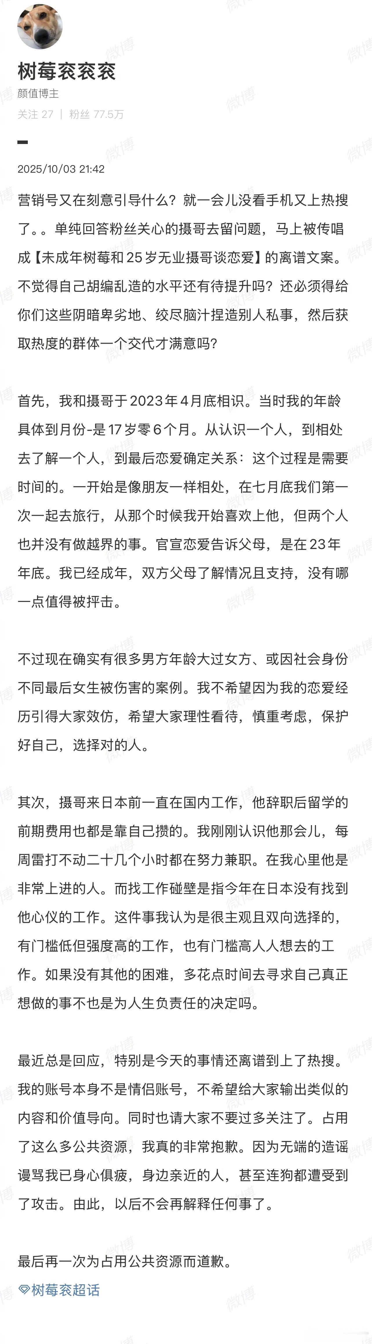 树莓发文回应,表示跟男朋友摄哥在一起的时候自己已经成年了树莓 摄哥