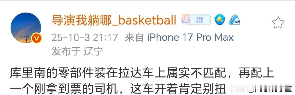 杀人诛心!上海热身赛两连败,球队和主教练惨遭辽宁自媒体暗讽! 张镇麟低迷,上海热身赛不敌浙江广厦,赛后,辽宁知名媒体人导演疑似发文暗讽上海男篮和卢伟,他把辽宁男篮比喻成库里南汽车,张镇麟比喻成库里南的零部件,而把上海比喻成拉达车,卢伟比喻刚拿证的司机,他所表达意思就是张镇麟太高档了,和上海这种低档次的球队不配,只有辽宁队这级别的球队才配得上,所以上海输球是球队实力和主教练水平问题,而不是张镇麟的问题!
