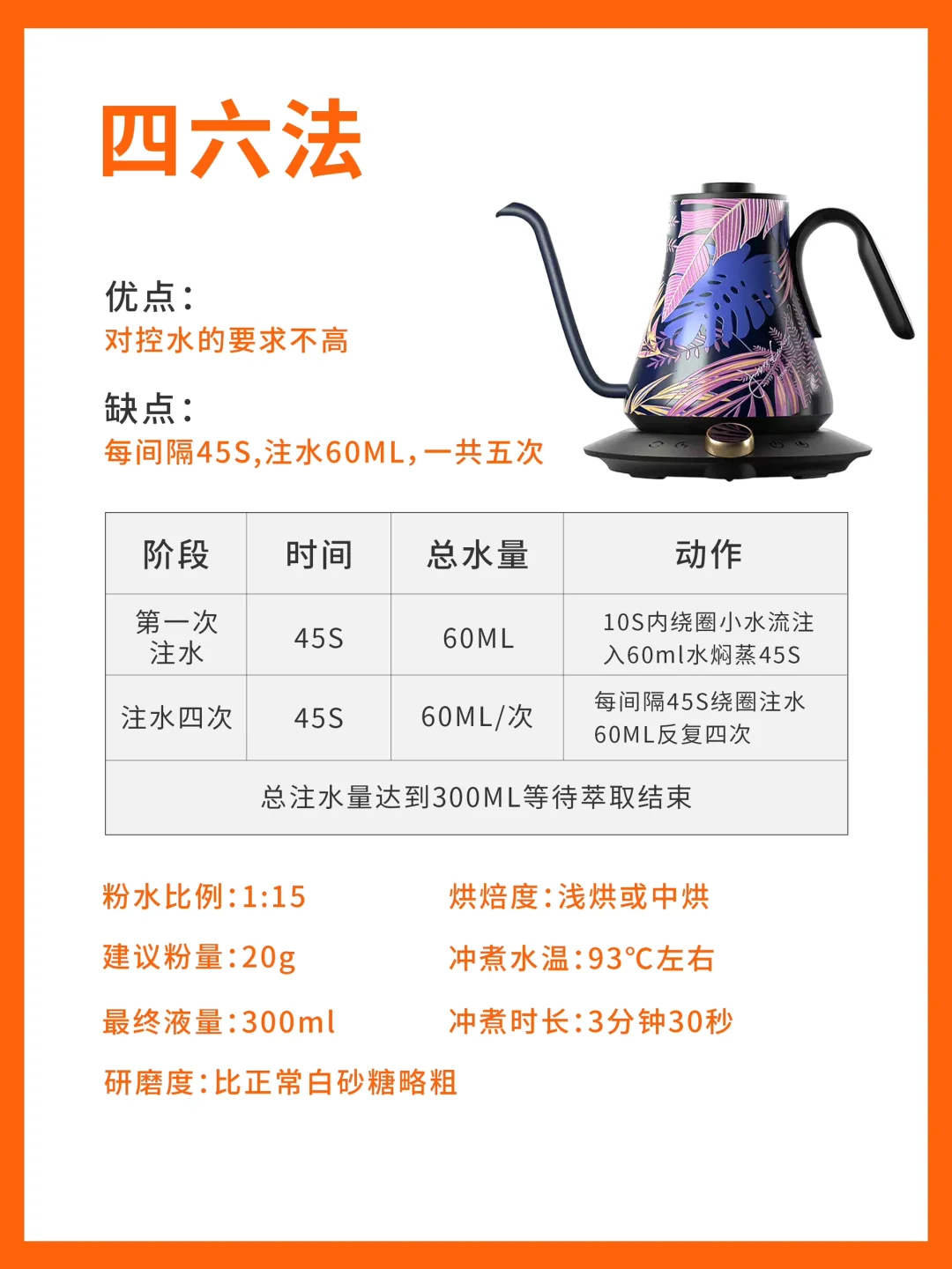 第一二段总注水量40%决定了风味走向,第三四五段总注水量60%决定了咖啡的口感,所以被称为四六法。