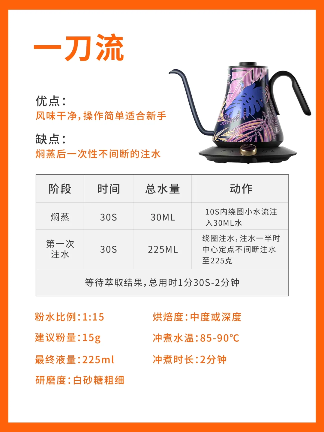 在注水30-45ml,闷蒸30秒一次不间断注水至225克。因为是一次注水完毕,可以使酸甜苦滋味更加平衡。