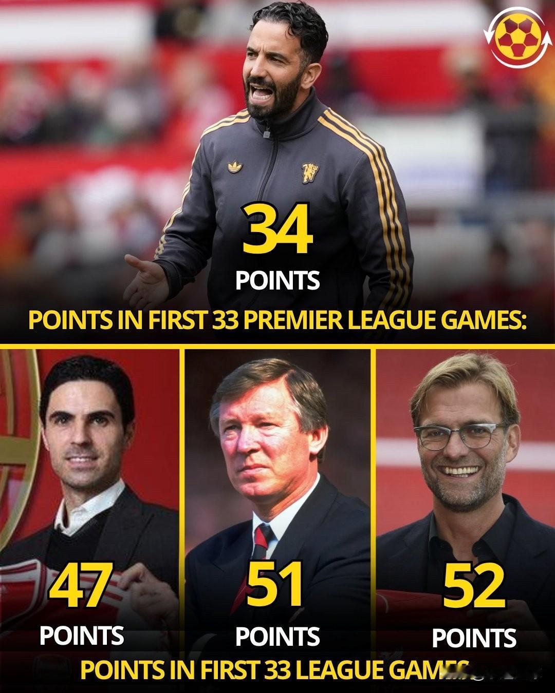 他们执教前33场联赛所获得的积分: 🔸 阿莫林(曼联):34分 🔸 阿尔特塔(阿森纳):47分 🔸 弗格森爵士(曼联):51分 🔸 克洛普(利物浦):52分 阿尔特塔、弗格森和克洛普都曾起步缓慢,但最终都取得了更大的成就。 你认为阿莫林也能做到吗?