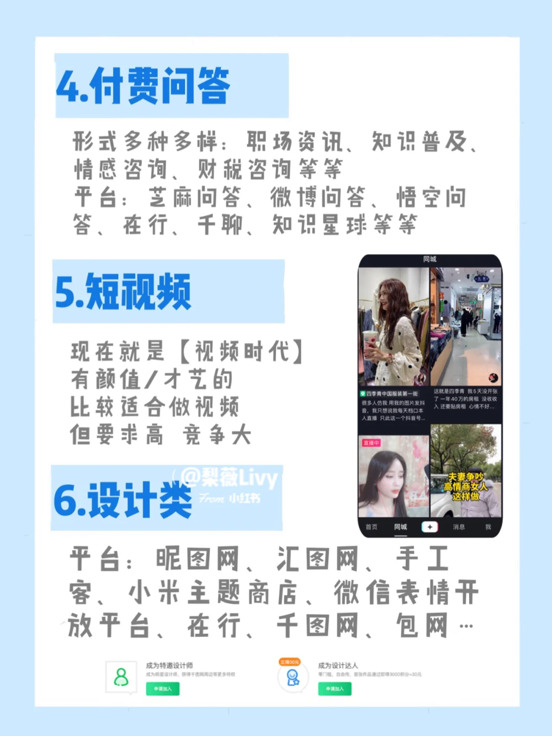 平台:昵图网、汇图网,手工课、小米主题商店、微信表情开放平台、在行、千图网、包图等等。