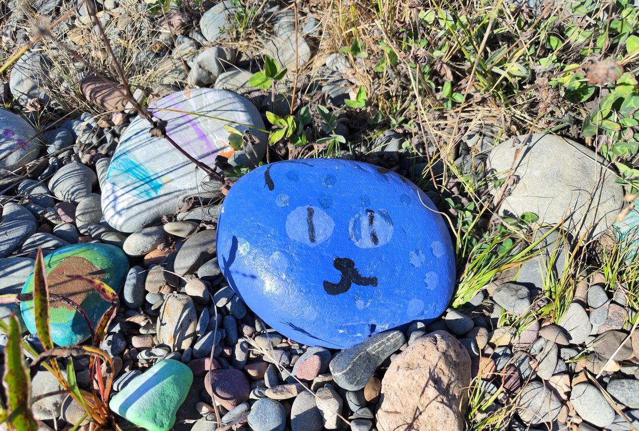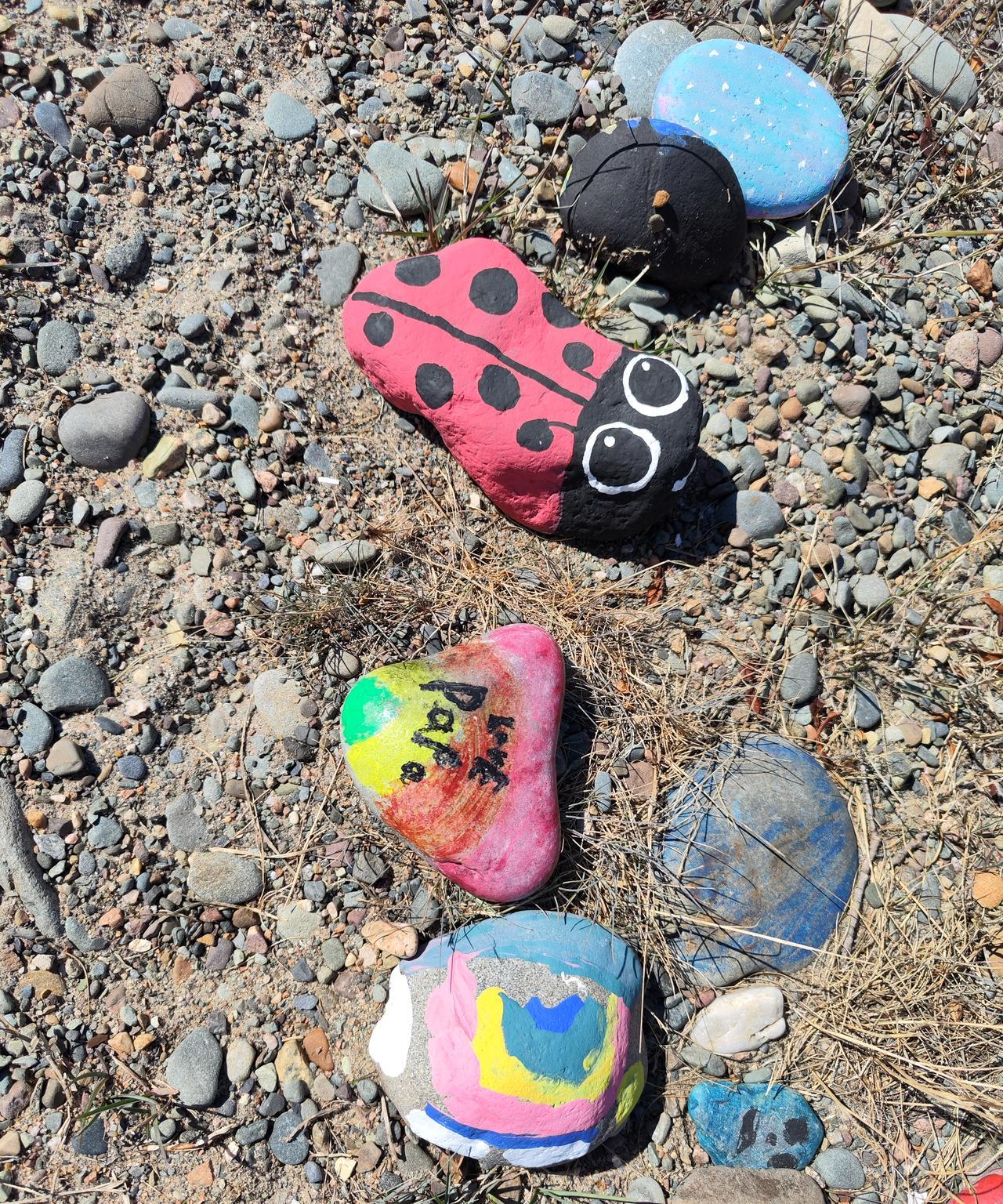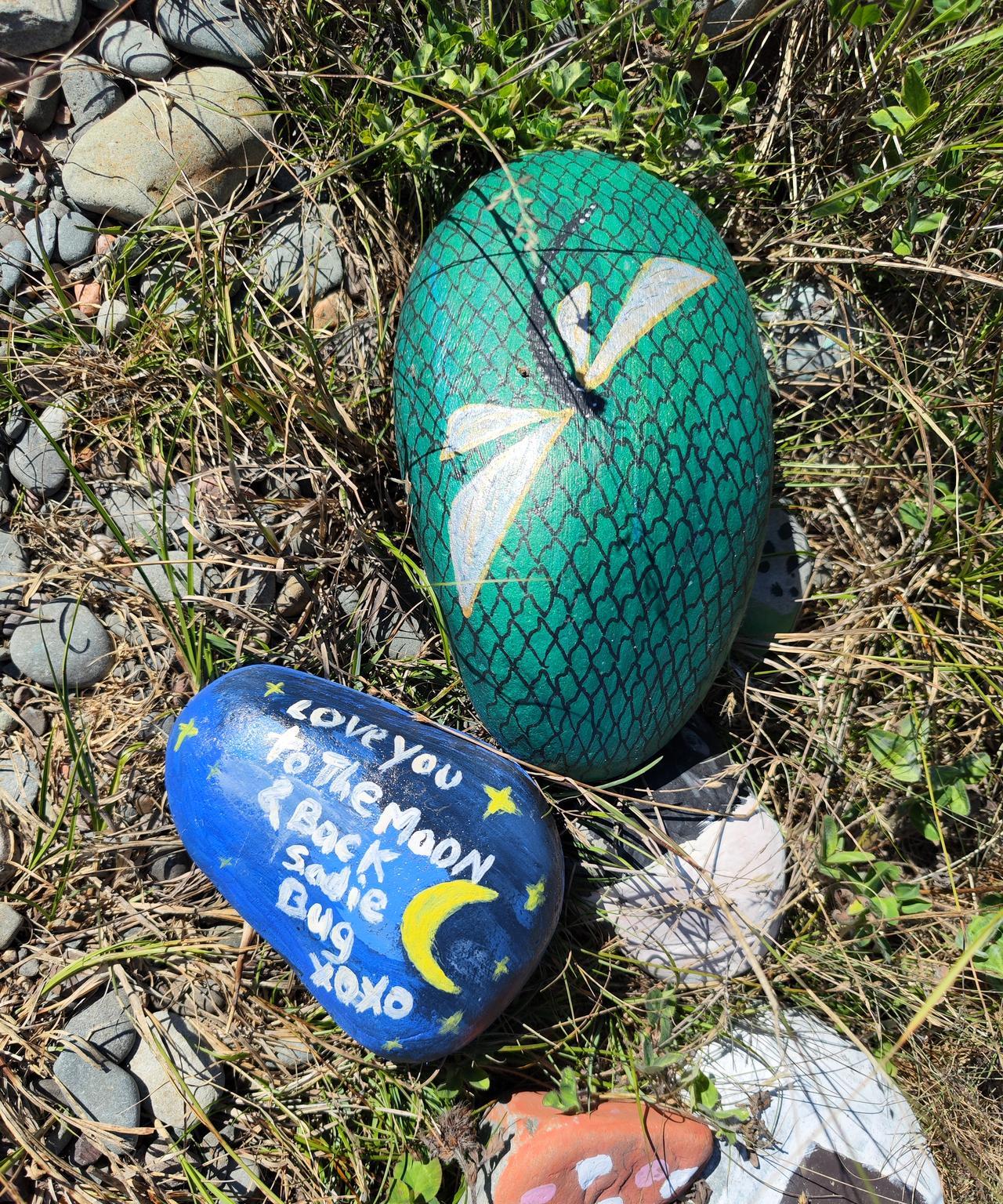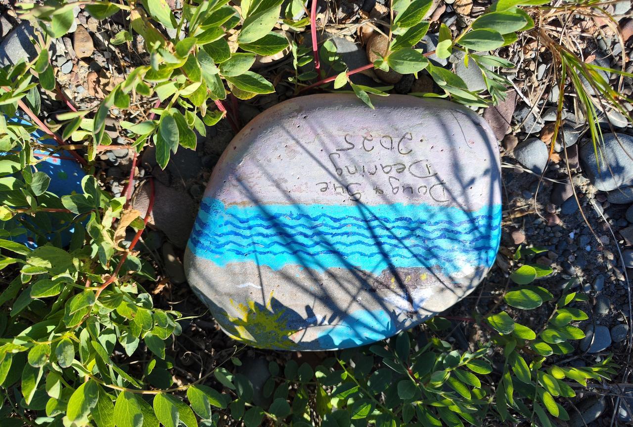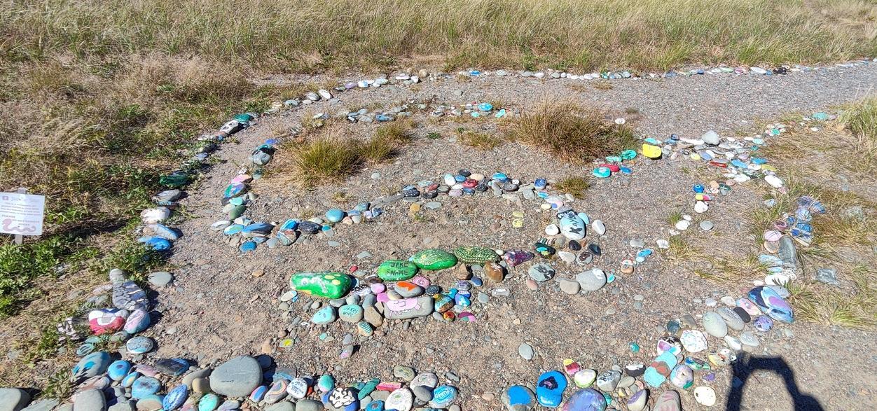 一个很有温度的海湾。 孩子城市的周边,有好多湾和好多湖,孩子今天又是驱车百公里看大海。 今年是中国的蛇年,大家画的各色各样的小石头,拿来摆了个蛇型阵。 走累了,孩子让我俩坐长椅上休息,她给我们拍照。正准备姿势,旁边过来一对和我们年纪差不多的夫妻,男人主动和孩子说,我给你们拍个全家照吧。 记不得这是最近在景点第几个要给我们拍照的人了,前几天有个女的给我们拍照时还说,要真心微笑,不要摆拍笑。很暖心。