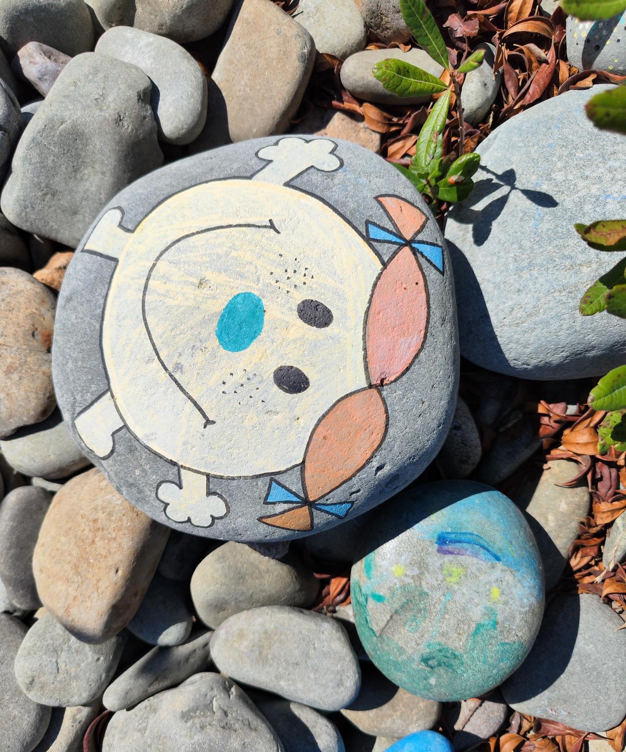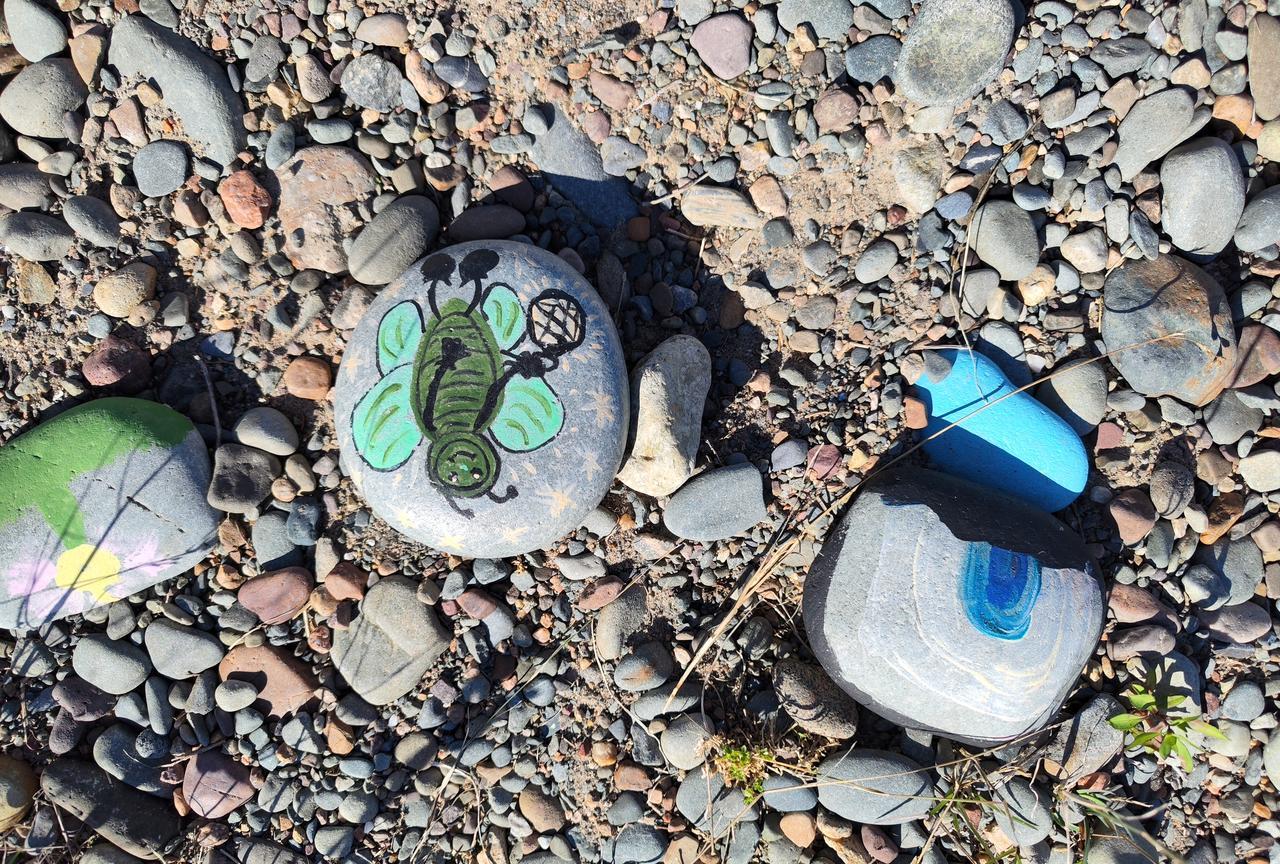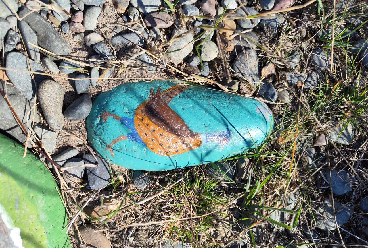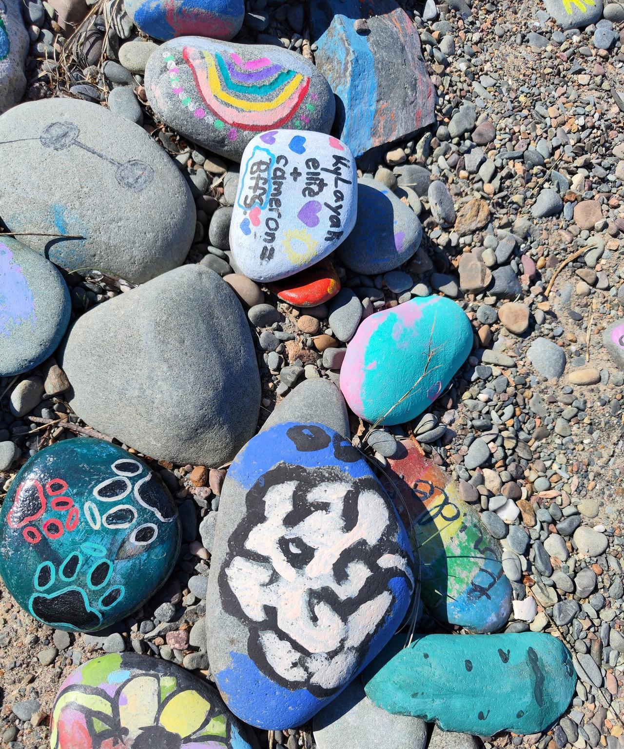 一个很有温度的海湾。 孩子城市的周边,有好多湾和好多湖,孩子今天又是驱车百公里看大海。 今年是中国的蛇年,大家画的各色各样的小石头,拿来摆了个蛇型阵。 走累了,孩子让我俩坐长椅上休息,她给我们拍照。正准备姿势,旁边过来一对和我们年纪差不多的夫妻,男人主动和孩子说,我给你们拍个全家照吧。 记不得这是最近在景点第几个要给我们拍照的人了,前几天有个女的给我们拍照时还说,要真心微笑,不要摆拍笑。很暖心。