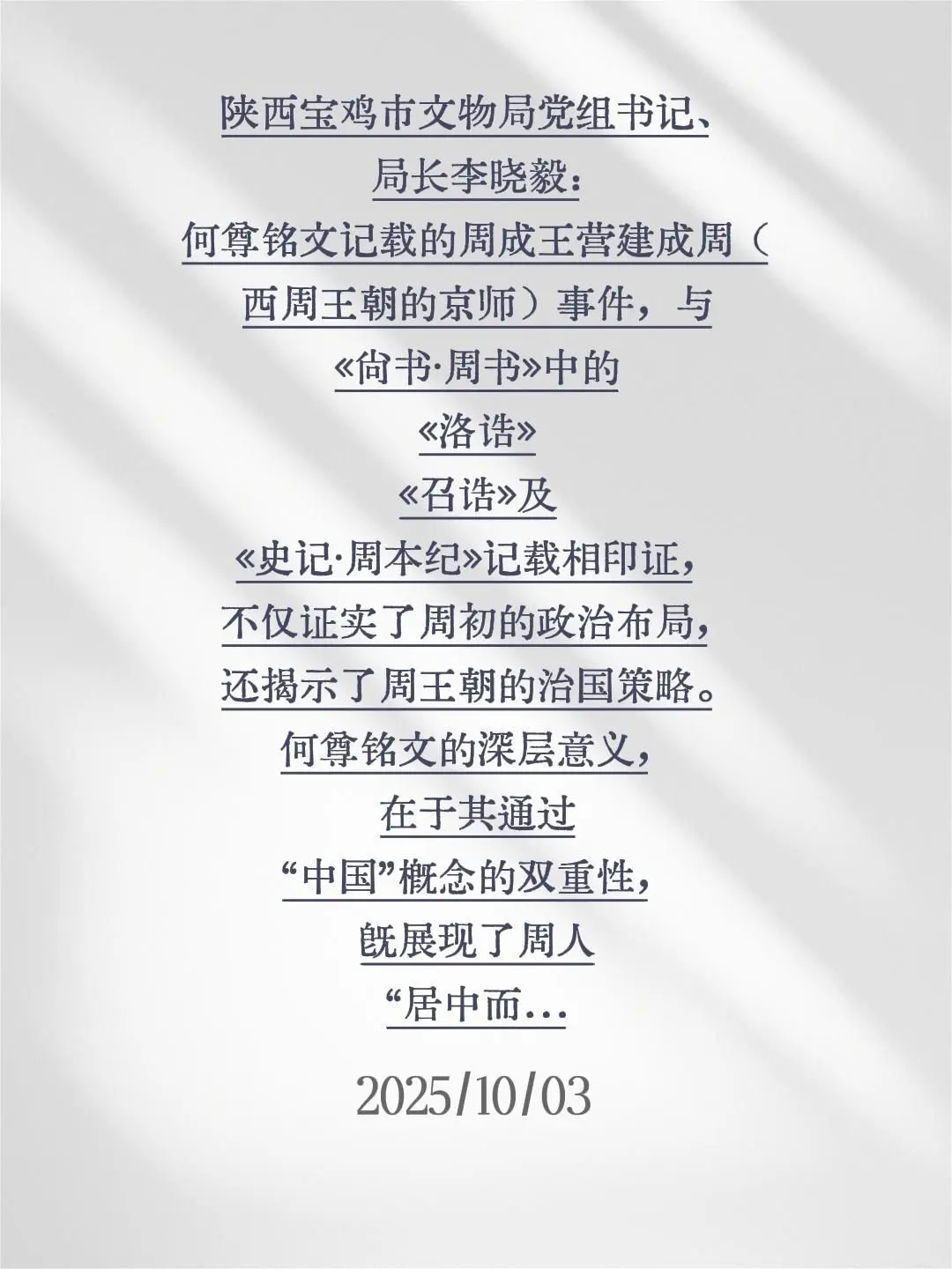 陕西宝鸡市文物局党组书记、局长李晓毅:何尊铭文记载的周成王营建成周(西周王朝的京师)事件,与《尚书·周书》中的《洛诰》《召诰》及《史记·周本纪》记载相印证,不仅证实了周初的政治布局,还揭示了周王朝的治国策略。何尊铭文的深层意义,在于其通过“中国”概念的双重性,既展现了周人“居中而治”的政治理念,更反映了从何尊铭文“地理中心”到“文化认同”的文明见证。这一始终承载兼容并蓄文明基因的“中国”概念,使中华民族在历史长河中既能不断吸收多元文化,又始终保持凝聚力。周人融合夏、商、周三族为“诸夏”,以礼乐制度为中心,形成超越族属的文化共同体。
