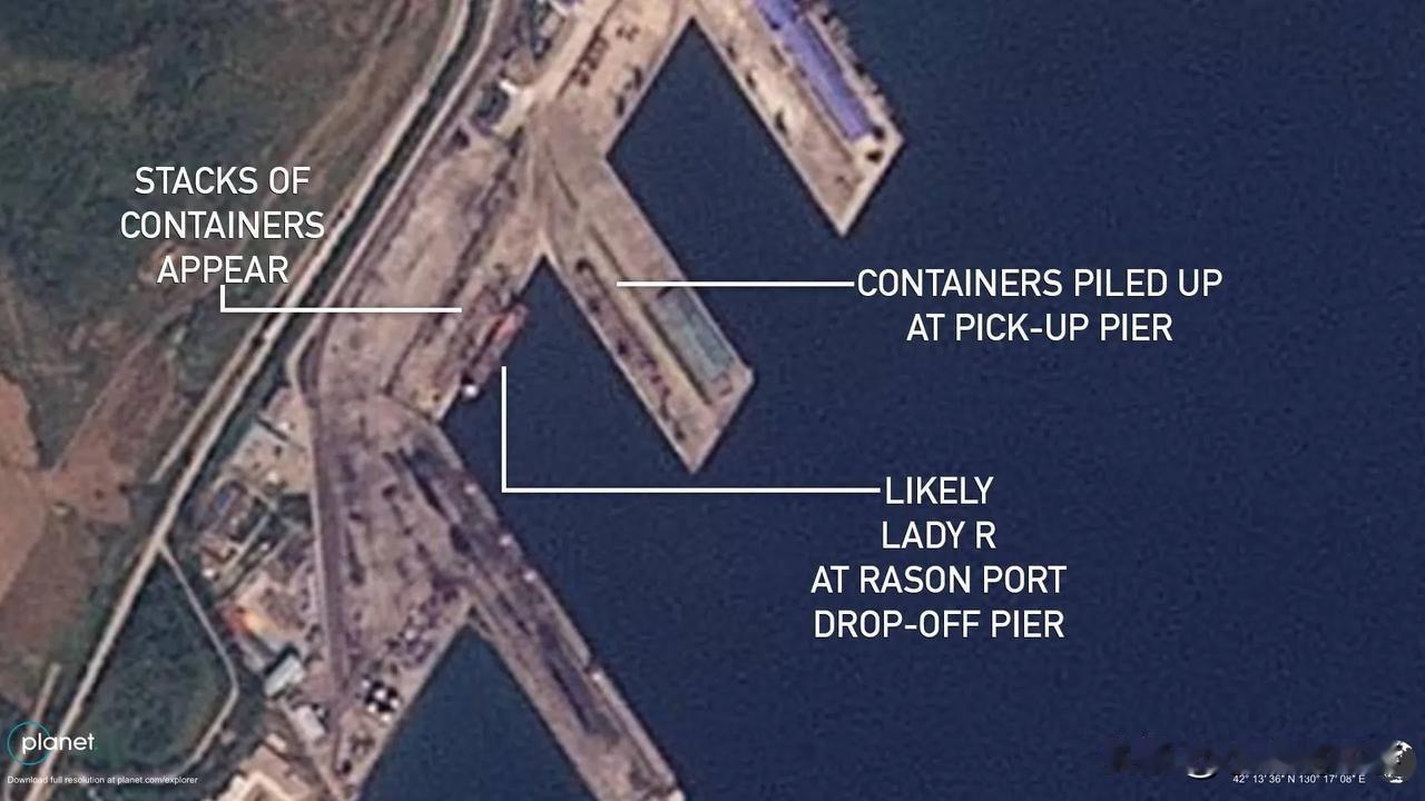 俄罗斯货船“Lady R”时隔两个月首次出现在朝鲜港口罗先,这可能表明海上武器供应的恢复。 卫星图显示,该船于10月1日向罗先港运送了集装箱货物。在此之前,该船于9月24日至26日在俄罗斯远东港口准备航行。 预计10月2日该船将停靠至附近堆满集装箱的泊位,这些自9月中旬起堆积的集装箱很可能等待装船,目前其具体装载内容尚不清楚。 俄罗斯货船 朝鲜船 朝鲜运输船