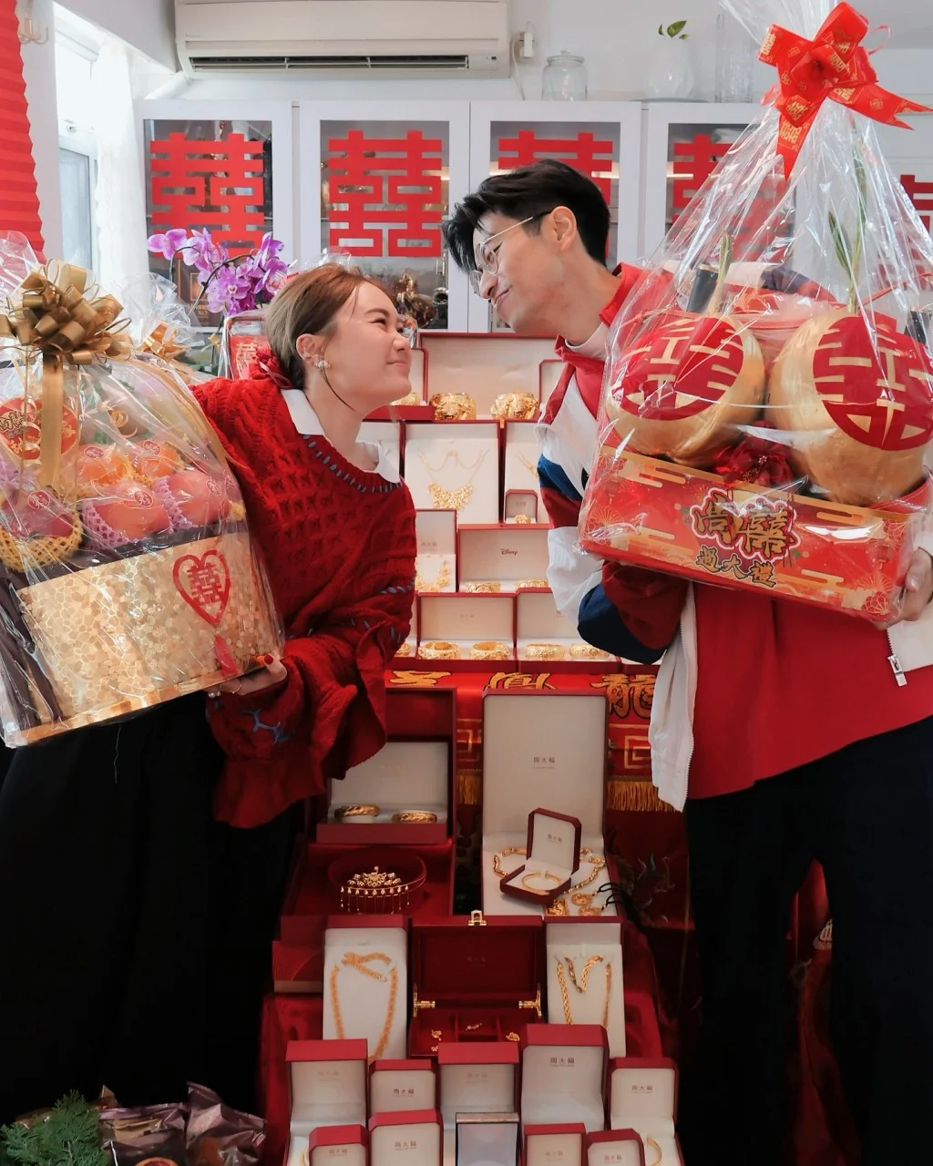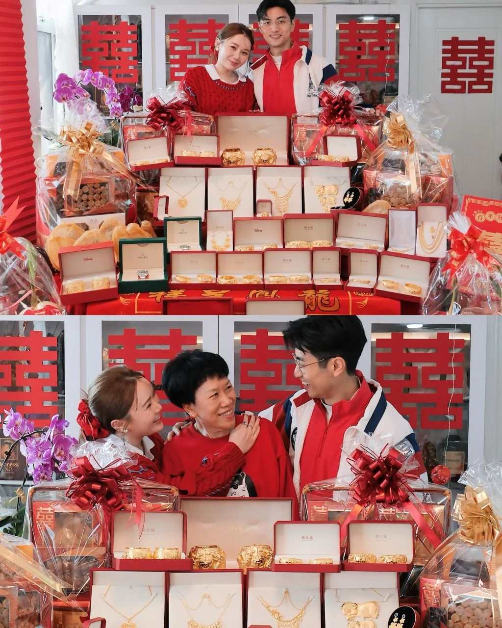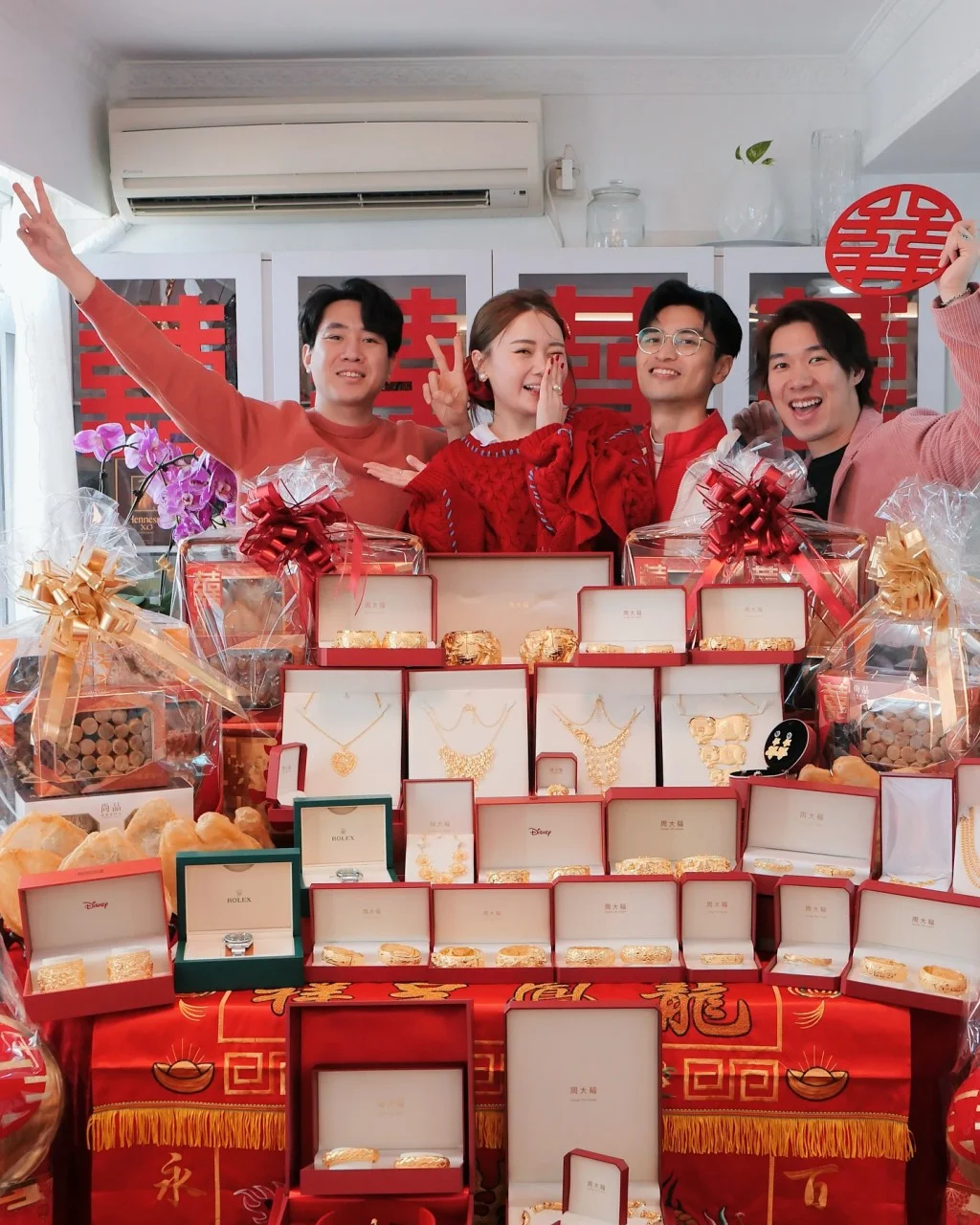 单是龙凤手镯已有十多对,其余大大小小金器如金猪牌、项链等更放满桌上甚至地下,还有两只名表,其余海味、水果、礼饼、椰子等等堆放在厅上,几乎放出门口,一众亲友都寸步难行,排场超级夸张。