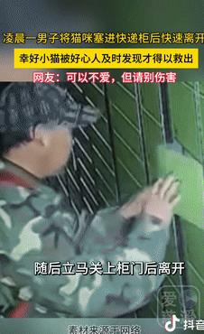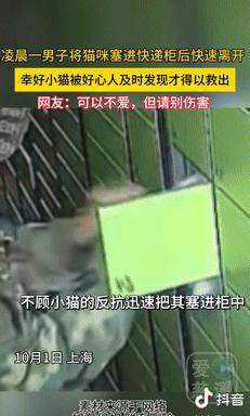 “坏到骨子里!”10月3日上海一男子凌晨发现有人取完快递,没关上柜门后,便不顾猫咪的反抗,快速将其塞到柜里,幸亏有人路过,听到了小猫求救的声音,于是想方设法把柜门打开,眼前的画面让人止不住的心疼,网友:可以不爱,但别伤害![无辜笑] 当天一名穿迷彩服、背红色背包的男子取完快递后,注意到旁边有个柜门没关严。 他左右看了看,四周没人,这时一只流浪猫正在快递柜附近走动,男子突然伸手抓住了猫,猫开始挣扎,但男子没有松手,而是把猫往那个开着的快递格里塞。 从监控画面可以看到,猫的前半身先被推进去,接着整个身体都被塞了进去,那个快递格的空间只够放一个普通包裹,猫被塞进去后几乎动弹不得,男子关上柜门,转身离开了。整个过程持续了不到一分钟。 快递柜关上后,里面的猫开始叫,声音透过柜门的缝隙传出来,但凌晨时分小区里很安静,没什么人经过。 大约过了几十分钟,一位居民路过快递柜附近,听到了动物的叫声,声音很小,但在安静的环境里还是能听见,这位居民停下来仔细听,确定声音是从快递柜里传出来的。 他马上联系了物业,物业工作人员赶到现场,又联系了快递柜的运维人员,但快递柜有密码锁,不是随便能打开的,运维人员查询系统记录,发现那个格口显示是空的,没有待取件。 几个人商量后决定用工具把柜门打开。撬开柜门后,看到猫蜷缩在格子最里面,毛都湿了,一直在发抖,工作人员把猫抱出来,猫的眼睛周围有些脏污,整个身体都在颤抖。 快递柜的格口是金属材质,内部空间密闭,只有柜门边缘有很窄的缝隙,现在是10月初,上海的气温还有二十多度,如果是夏天高温时节,密闭空间里的温度会更高。 监控视频记录下的这一分钟,让一只流浪猫差点失去生命,也让更多人开始关注小区里那些无家可归的小动物,它们和人类共同生活在同一个空间里,如何相处,或许需要每个人都想一想。 网友们议论纷纷: “看完监控血压上来了,猫猫挣扎得那么厉害,这人怎么下得去手啊!” “快递柜内部根本不透气,如果不是被人发现,小猫肯定活不到早上。” “建议人肉这个背红色书包的,必须让他公开道歉。” “大概率是心理变态,正常人不喜欢猫顶多就是赶走,不会故意往死里整。” “快递公司也应该担责,为什么柜门能一直开着不自动上锁?” “上海动保组织能不能介入?这已经涉嫌虐待动物了。” “看着猫猫缩在角落的样子太难受了,希望有好心人能收养它。” “录下全程监控就是铁证,支持追究法律责任。” 您认为应该怎样处理这类虐待动物事件,是否需要立法加强惩罚? 官方信源:中国新闻网