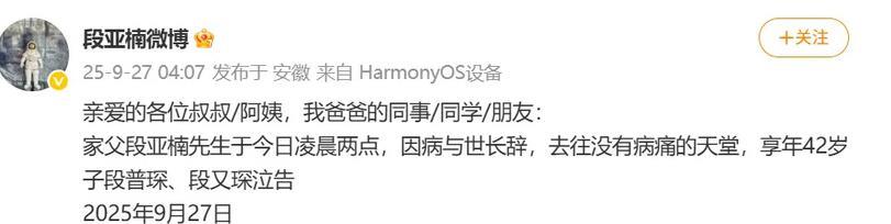 42岁安徽交警段亚楠,因胰腺癌去世了,原来之前只是城区基层交警,风里来,雨里去,维护秩序,十分辛苦。 9月28日凌晨,安徽亳州警察段亚楠的朋友圈更新了最后一条动态,这句带着无尽眷恋的遗言,让无数熟悉他的人瞬间红了眼眶。 42岁的生命永远定格,16年的警徽岁月画上句点。 这位警界的“网络红人”终究没能战胜胰腺癌,留下了妻子和两个年幼的儿子。 刷到亳州公安那条黑底白字的讣告时,很多人才惊觉那个常在地铁大屏上出现的反诈宣传员已经离开。 段亚楠负责公安宣传工作多年,制作的反诈短视频接地气、记得住,抖音上的交通安全动画更是收获了百万播放量。 去年还因此获评“亳州好网民”称号。 但比起这些职业成就,更让人难忘的是他藏在工作背后的温暖。 同事们说,段亚楠连续三年资助山区儿童上学,去年冬天顶着零下的寒风给留守儿童送棉衣,孩子们都亲切地叫他“段爸爸”。 他的日记里写着,如果我的痛苦能换来别人的健康,我愿意。 这份善良甚至延续到生命最后一刻,倒下前一天,他还在朋友圈为同事的公益活动点了赞。 可谁也不知道,这个总是笑着传递温暖的人,深夜里要靠止痛药才能熬过癌痛的折磨。 段亚楠的抗癌之路走了两年,而故事的开端藏在一次被忽略的“小毛病”里。 一年前他做肠胃镜检查,被诊断为胃十二指肠溃疡,医生开了三个月胃药。 后来他才意识到,正是这次误诊,让胰腺癌有了喘息的机会。 等到体重一个月掉十斤、血糖飙到20、腰疼得直不起身时,他还以为是熬夜加班的后遗症,硬扛着没去医院。 确诊后的日子充满了起伏。在上海某知名医院做完切除手术和化疗后,他曾在2025年2月兴奋地发微博。 “头发和眉毛已经长出碴子了,一切在向好。” 还调侃自己体验了一把“光头强”,用“野火烧不尽,春风吹又生”表达对生命的渴望。 可这份希望没能持续太久,9月16日,躺在病床上的他用颤抖的手写道:“虚弱、难受,各种折磨,多亏妻子深夜陪伴”,字里行间满是无力。 段亚楠的经历,揭开了胰腺癌“沉默癌王”的残酷面纱。 胰腺藏在左上腹深处,和肠胃紧紧相邻,早期症状极易混淆。 中国医学科学院肿瘤医院的临床案例显示,早期胰腺癌误诊率高达30%,很多患者像段亚楠一样,把上腹钝痛、脂肪泻当成普通肠胃病。 更可怕的是,这种癌症初诊时能手术的患者仅占15%-20%,5年生存率不足10%,央视曾报道其发病率与死亡率几乎持平。 他的离开也带来了改变。亳州公安连夜修改了健康保障规则。 民警满35岁强制做肿瘤标志物+增强CT,费用由局里承担,还不占用年假。 “平安亳州”项目组把他的12条动画剪成合集,每点击一次就向“亚楠健康关爱基金”捐两毛钱,三天就筹了47万,够200个基层辅警做早筛。 警界知名人士“江宁婆婆”的悼念说得恳切,人这一生,不过生死二字。 你们要好好活下去,这样才能永远记得亚楠。 在惋惜之余,我们更该读懂他用生命传递的警示。 医生提醒,无糖尿病家族史却突然血糖升高、吃油腻食物就腹泻、持续腰背痛,这些都是胰腺癌的信号。 40岁以上、有慢性胰腺炎病史或长期高脂饮食的人群,每年做一次超声内镜很有必要,哪怕是自费1800元的ctDNA早筛,也比错过治疗时机划算。 段亚楠的朋友圈还留着9月20日的动态,他引用张震岳的话,上坡要努力,下坡要开心。 这份豁达背后,是对生命的不舍。 他用42年的人生告诉我们,所谓的“来日方长”,从来都建立在健康的基础上。 那些被我们忽略的身体信号,那些以“忙”为借口的拖延,可能都会成为无法挽回的遗憾。 如今,段亚楠提前下了人生的列车,但他留下的“健康车票”值得每个人收好。 别等病痛来袭才追悔莫及,好好吃饭、规律作息、重视预警,这才是对自己和家人最好的负责。 毕竟,就像段亚楠用生命印证的那样,身体健康才是最重要的。 信息来源:封面新闻2025-09-28发布:送别!警界网络知名人士段亚楠不幸去世,年仅42岁