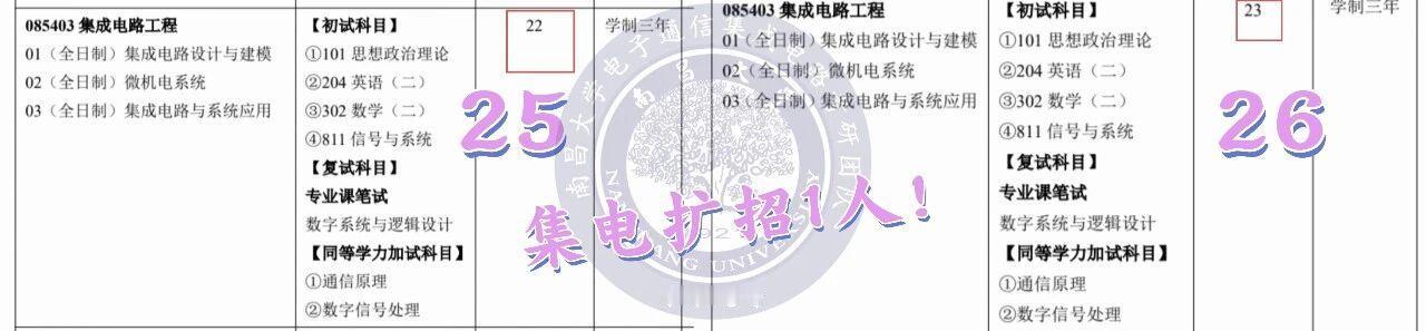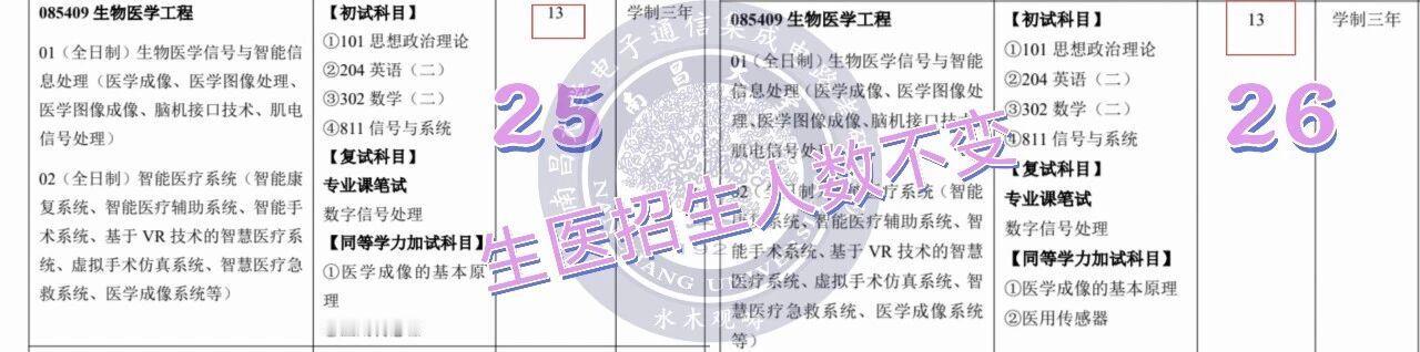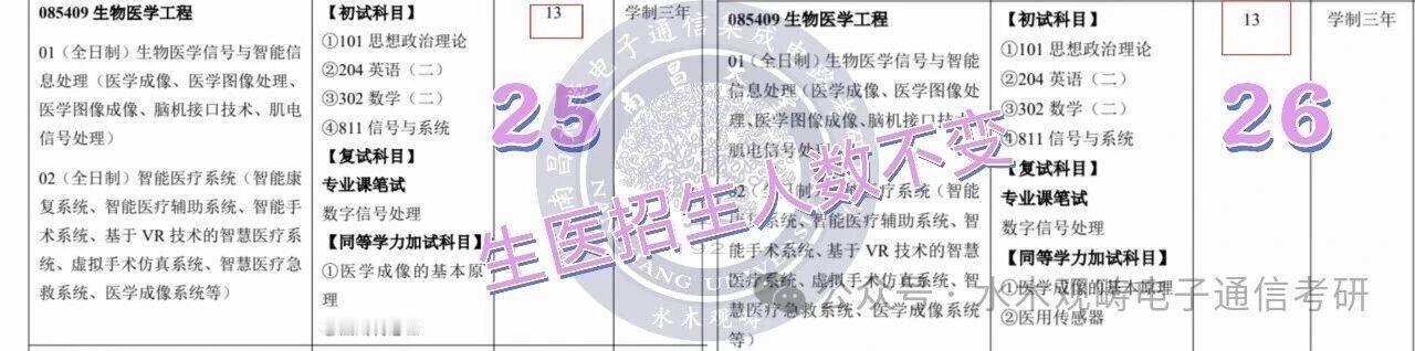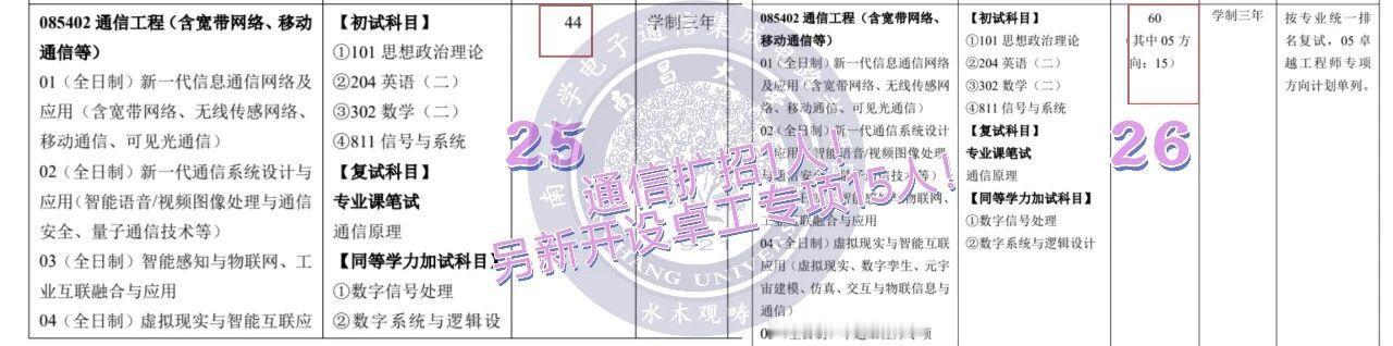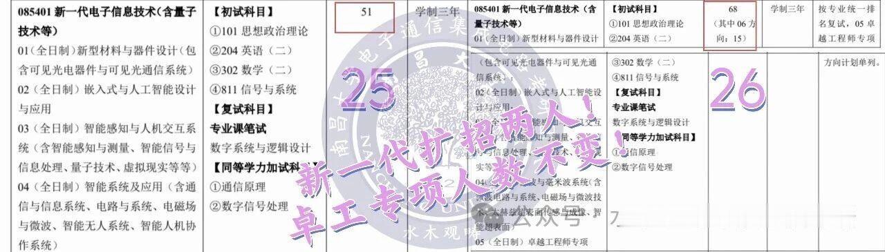 双非可冲!全面扩招,拜拜卓工院 南昌大学信息工程学院26招生专业目录公布(含推免) 1、信息与通信工程全日制共扩招1人(34→35)! 2、新一代电子信息技术全日制共扩招2人(51→53)! 该方向招收卓越工程师专项人数不变,共招15人! 3、通信工程全日制共扩招1人(44→45)! 该方向新招收卓越工程师专项15人! 4、集成电路工程全日制共扩招1人(22→23)! 5、生物医学工程全日制招生人数不变,共招13人! 6、电子信息非全日制招生人数不变,共招15人! 注:26届招生将卓越工程师专项放在信工院招生,单独划线,不再开设卓工院招生! 2026南昌大学电子通信考研群:347713924 2027南昌大学电子通信考研群:729395179