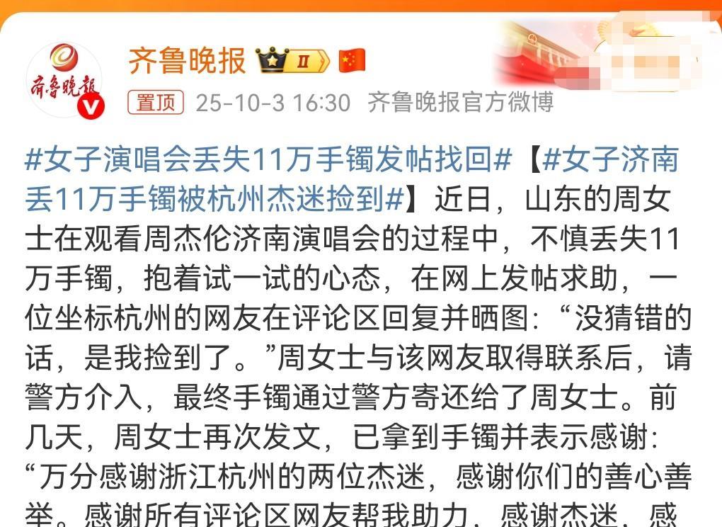 不得不说,这真的是太走运了,难得啊。 近日,一女子竟然在周杰伦演唱会丢失了11万的手镯。 抱着试一试的态度在网上发帖。 没想到还真的让捡到的网友看到了。 通过警方介入,成功被寄回。 女子发文感谢两位杰迷。#女子演唱会丢失11万手镯发帖找回#