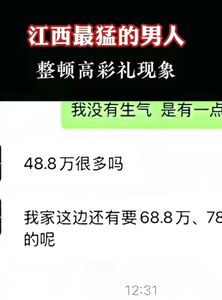 这两天看到最多的就是陕西旬阳的小伙。 结婚给了最高的彩礼20万, 却因为下车费2万元, 压死了求生的稻草,选择轻生。 看看这位江西的牛人。 和对象相恋了6年。 说到谈婚论嫁。 女孩说他们这里彩礼最低488000。 而且要了彩礼之后是给她弟娶媳妇用。 小伙子想了想自己只有30万。 没必要去填坑。 果断选择分手。 准备的彩礼钱自己去买了宝马车。 有这样头脑和思维的男孩, 肯定会遇到良缘的! #彩礼谈崩#