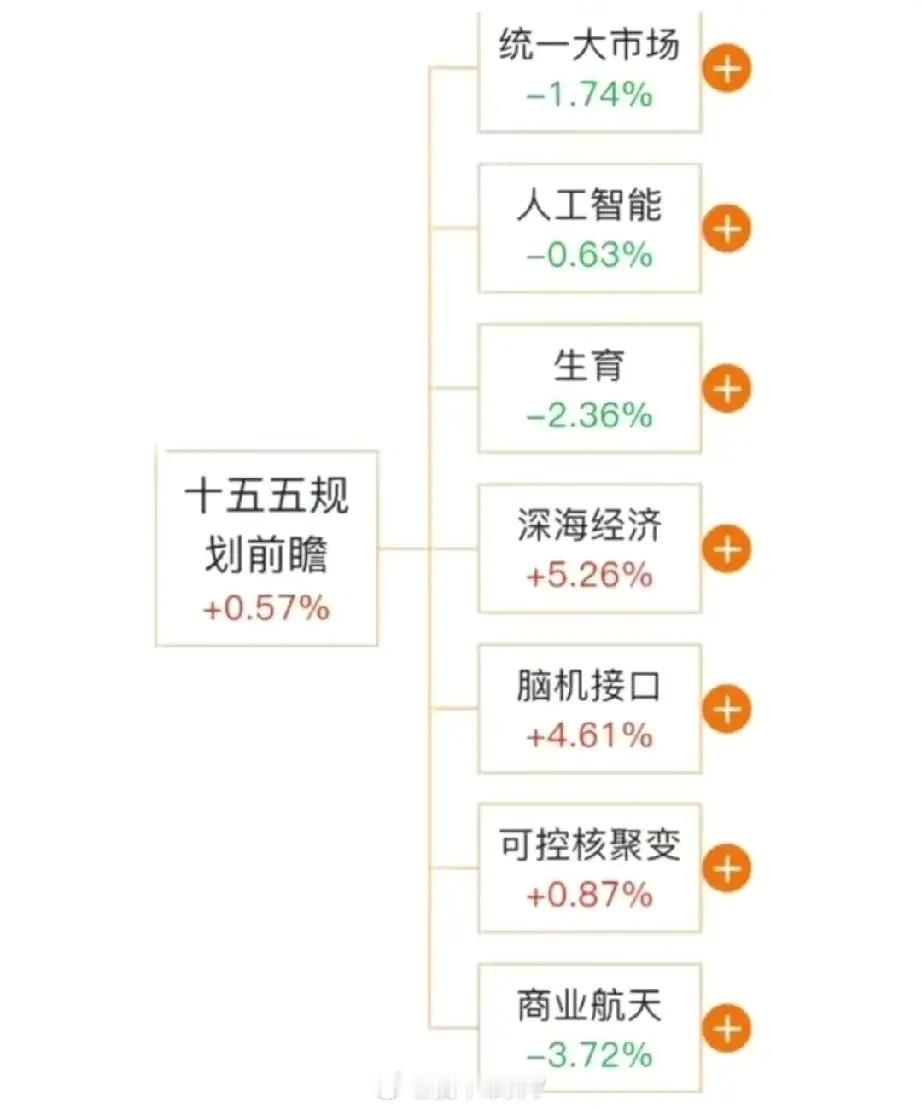 十五五规划的7大预期题材:商业航天概念、可控核聚变概念、人工智能概念、脑机接口概念、深海经济概念、生育/多胎概念、统一大市场概念。