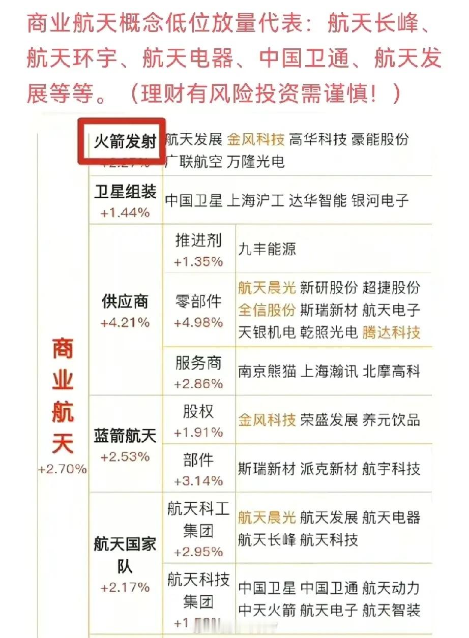 商业航天概念低位放量代表:航天长峰、航天环宇、航天电器、中国卫通、航天发展等等。(理财有风险投资需谨慎!)