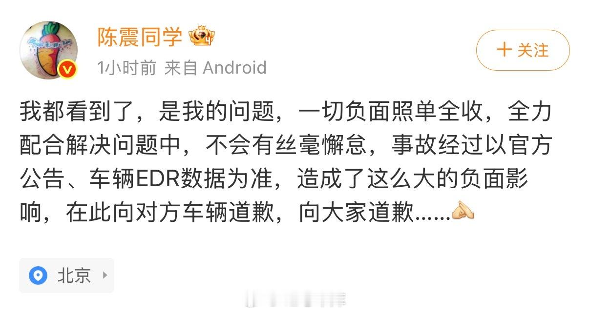 陈震承认了自己的问题并且致歉,另外表明事故经过以官方公告、车辆EDR数据为准。