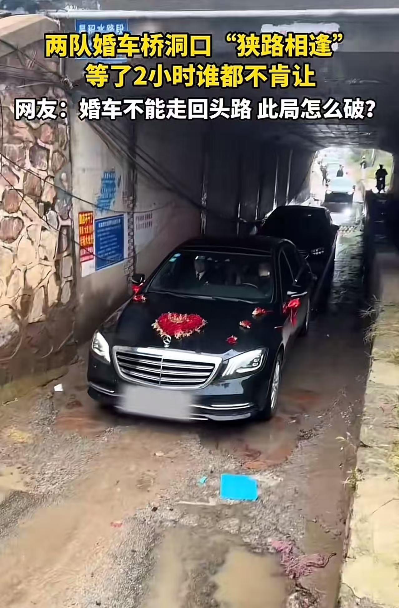 山东,两队婚车桥洞口“狭路相逢”,等了2小时谁都不肯让!网友:婚车不能走回头路,此局怎么破? 10月3日是个黄道吉日,喜事扎堆,结婚乔迁都选在了这一天!可是在一个狭窄的桥洞口,却上演了一场令人啼笑皆非的一幕! 这个桥洞空间有限,仅能容许一辆车缓缓通过。平日里,若是两车在此相遇,需要一方后退,为对方让出前行的道路。 可这一天情况却大不相同,按照当地的传统习俗,婚车一旦上路便不能走回头路,要是倒车了,就会被认为“不吉利”,会给新人的婚姻生活带来不好的影响。 于是,双方的新人都打定了主意,谁也不肯退车让路。 就这样,两队婚车在桥洞口僵持了起来,这一僵就是整整2个小时。 在这2个小时里,路被堵得严严实实,后面的车辆排起了长龙,喇叭声此起彼伏,可就是没人能打破这个“死局”。 此事引发了热议,有网友说,很多人理解错了吧?不是车不能回头,是人不能回头而已,这事不就好办了?双方交换红包,人下车走过去,车调好接着走,该上车就上车。 也有网友说,简单的不能再简单了!双方新人下车交换礼物!两方相互换车!双方倒车退出道路这叫幸福“倒”家! 还有网友说,如果说报警处理的话,一般都是没有进涵洞的给进涵洞的车让路。大喜的日子,双方各让一步。进入涵洞的婚车的人,拿着两条烟给没有进入涵洞的车辆分分。没有进入涵洞的车队就会给让开一条道路。互相都僵持不下,谁也走不了。 在我看来,这原本是双喜临门的好事,两队婚车相遇本应是“喜上加喜”,却因为所谓的习俗而互不相让,最后闹得个路堵心也堵,实在是得不偿失。 所谓的婚车不走回头路,这不过是一种没有科学依据的迷信说法罢了。婚姻的幸福与否,怎么可能取决于婚车是否倒车呢? 相反,我觉得在这个时候,哪辆车愿意主动让行,哪对夫妻或许更能相扶到老。因为主动让行体现的是一种格局,是一种愿意懂得忍让的品质。 在婚姻生活中,难免会遇到各种各样的矛盾和分歧,如果双方都能像让车的这一方一样,多一些包容和理解,少一些斤斤计较,那么婚姻生活自然会更加和谐美满。 而那些死活不肯让车的夫妻,或许在未来的日子里,会因为一些鸡毛蒜皮的小事就争得面红耳赤,互不相让。 我们不能让这些没有道理的习俗束缚了我们的行为和思维,在面对类似的情况时,应该多一些理性和智慧,少一些盲目和固执。 毕竟,真正的幸福是靠夫妻双方共同努力经营出来的,而不是靠一些虚无缥缈的习俗来保佑的。