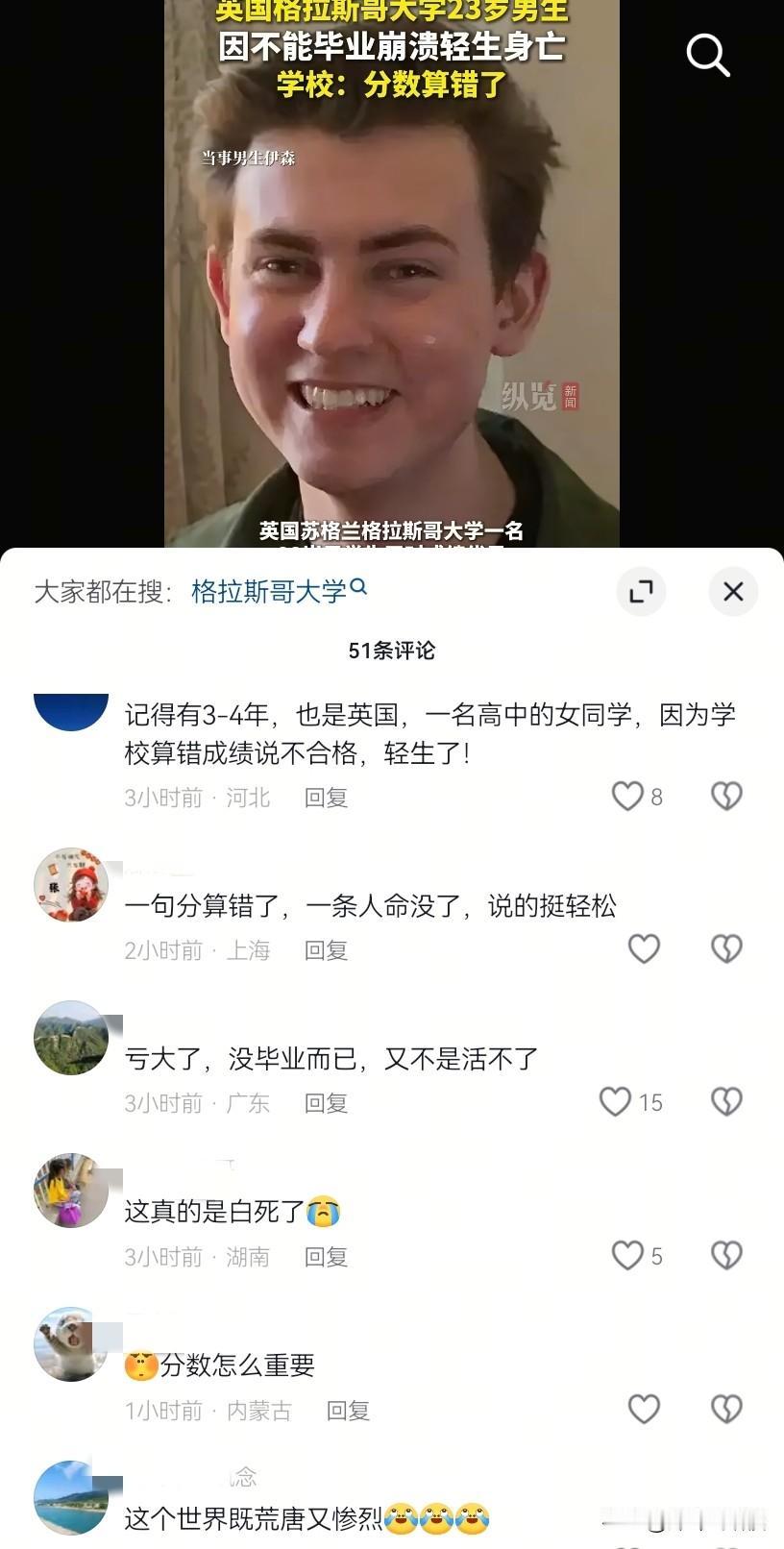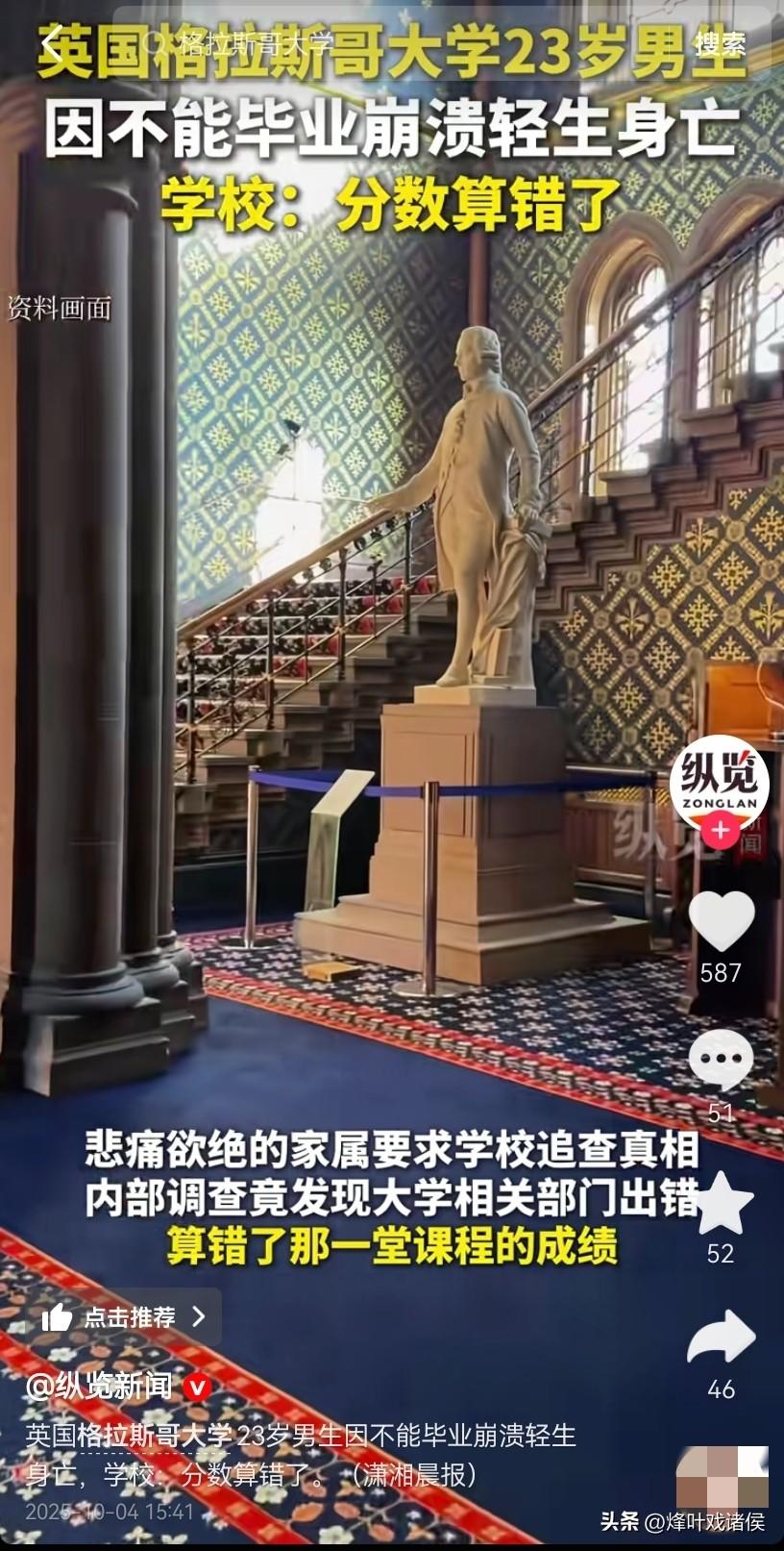 英国一所知名大学,弄出了一个大乌龙事件。 起因23岁大学生离世,事件却带来两个反转,第一,男生因不能毕业在家轻生了,当你以为他脆弱时,第二反转来了,调查组发现,是学校把分数算错了。 一起来看看这起悲剧,有多么荒唐。 据潇湘晨报的消息: 这位23岁的大学生长得相貌堂堂,平时成绩很好,本来都要去参加毕业典礼了,却在家收到了“学分不足”的消息,这也意味着他今年不能毕业了。 换成普通人的思维,不能毕业大不了再复读一年,明年毕业不就行了。 可这位男生不一样,听到这个消息后,不是第一时间去找学校复核分数,而是在家选择了轻生。 据男生的母亲说,孩子在学校的成绩很好,不能毕业就是因为去年有一门科目得了0学分,最终导致了毕业的时候“总学分不足”。 “男生去世”虽然发生在去年的12月份,但近日因为男生的母亲首次在公开场合讨论这起悲剧,进而被媒体报道后,这起“乌龙事件”才被广为流传。 孩子去世后,家长就要求学校查明真相,而这所学校的内部调查组也是一点不含糊,致歉并最终告诉了家属是自己学校的某位老师“算错了那一门科目的成绩”! 听到这个消息的男生家长,不知道是何心态,又会不会再找学校讨回说法呢? 因这位男生是在家轻生去世了,那么谁来为他的去世担责呢,是他自己,还是学校呢? 大家怎么判断?
