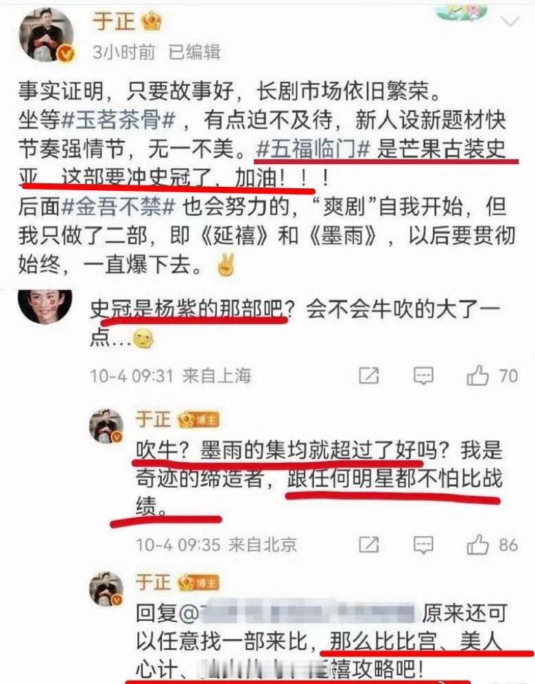 于正还是憋不住了,说《玉骨茗茶》冲史冠,被网友提醒史冠是《国色芳华》后说墨鱼就已经超了,不怕和任何明星比实绩,可以拿以前的爆剧来比