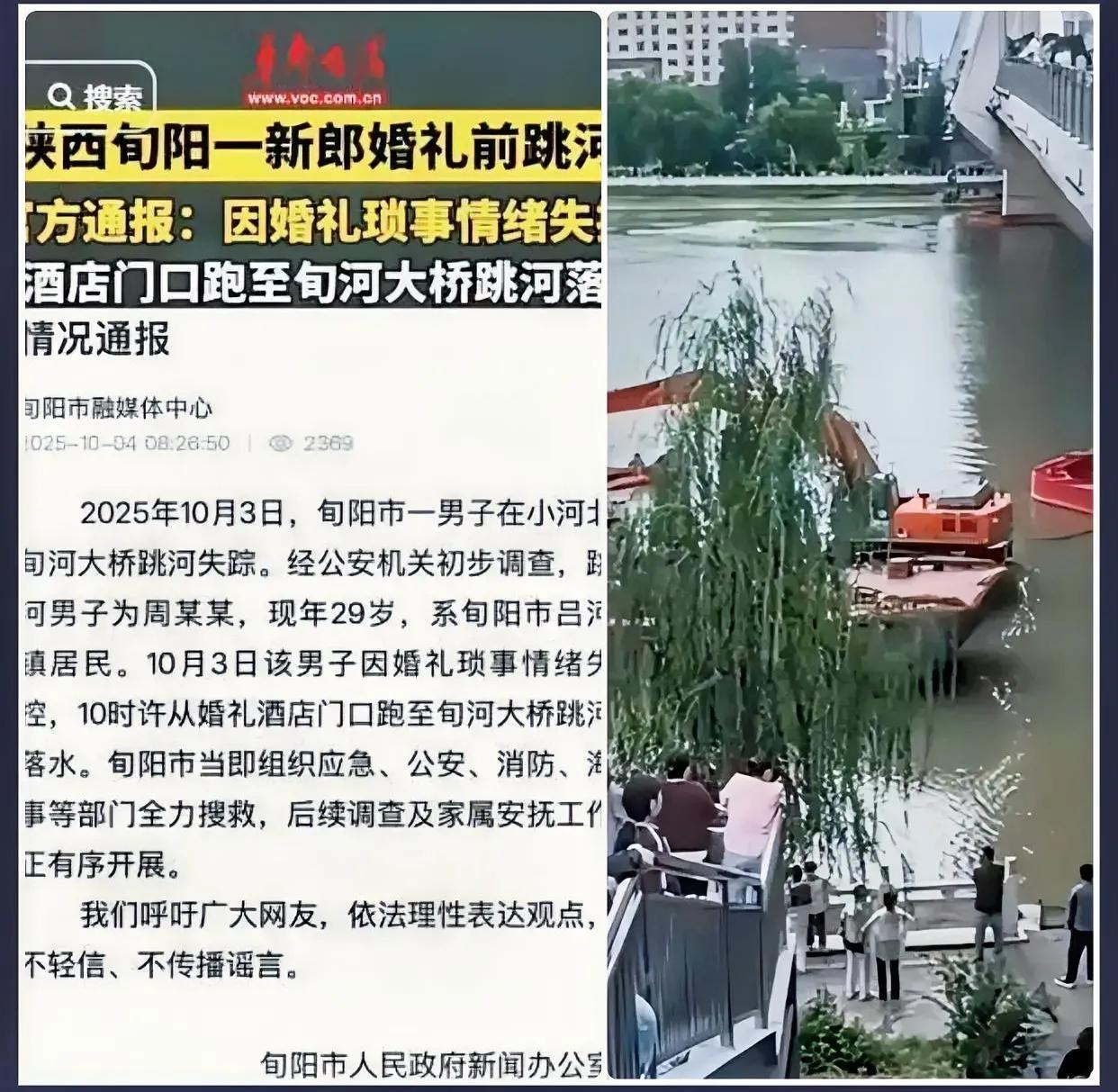 从官方的报道中我们得知,新郎确实是因为婚礼上的琐事跳河轻生, 你们说这叫什么事啊,真不行把婚礼退了不也行吗?丢脸总比丢命强。 我觉得周某阳的父母对此事估计也是自责不已, 如果他们不催孩子结婚, 也不会变成白发人送黑发人的结果。 人生苦短。 如果孩子不愿意结婚,那就由着他吧! 听说两人相亲认识的可能性很大。 大家一定要珍爱自己的生命,不要寻短见。
