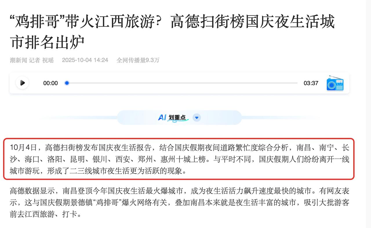国庆夜生活最火爆的地方,居然不是一线城市?看似不正常,但仔细一想很符合实际情况。 在10月4日的时候,高德扫街榜发布国庆夜生活报告。这份报告显示南昌、南宁、长沙、海口、洛阳、昆明、银川、西安、郑州、惠州这十个城市成为国庆夜生活最火爆的地方。 让人意外的是,这十个城市里面,没有北京、上海这种超一线城市。 但仔细想想,好像也合理。 因为平时的一线城市夜生活很丰富,主要还是大家工作压力大,所以会选择在夜晚的时候放松一下,但到了国庆,人们都放假了,肯定要去一些烟火气更足,更有特色的城市来体验当地的风土人情,感受人间烟火气。 比如说长沙,本身长沙的夜生活就是非常丰富的,那现在国庆假期大家有时间慕名而去体验长沙的夜生活,自然长沙就会更火爆了。再比如南昌,在鸡排哥火爆网络之后,很多人去景德镇看鸡排哥,然后顺带体验一下南昌的风貌,南昌就迅速冲上了国庆夜生活最火爆的城市。 通过高德的这个夜生活报告,也能明显感受到,一线城市发展的很好,但大家还是更喜欢放松,有特色的城市体验生活。
