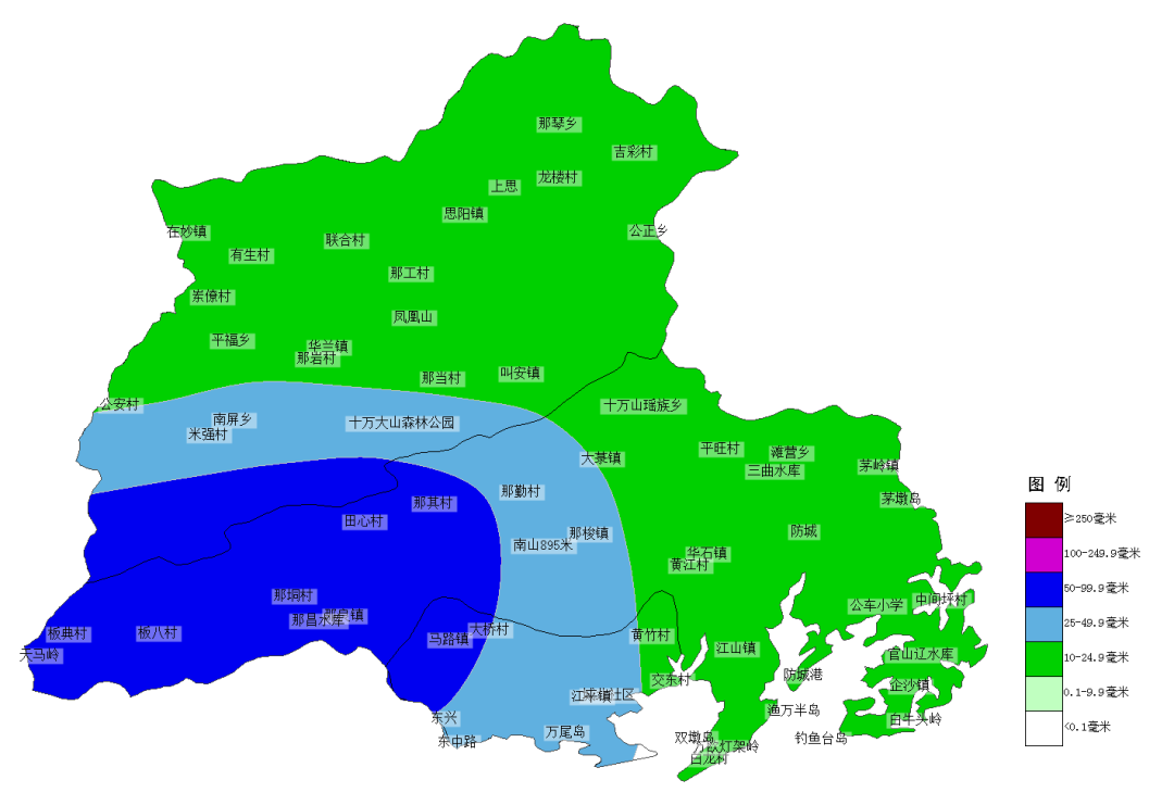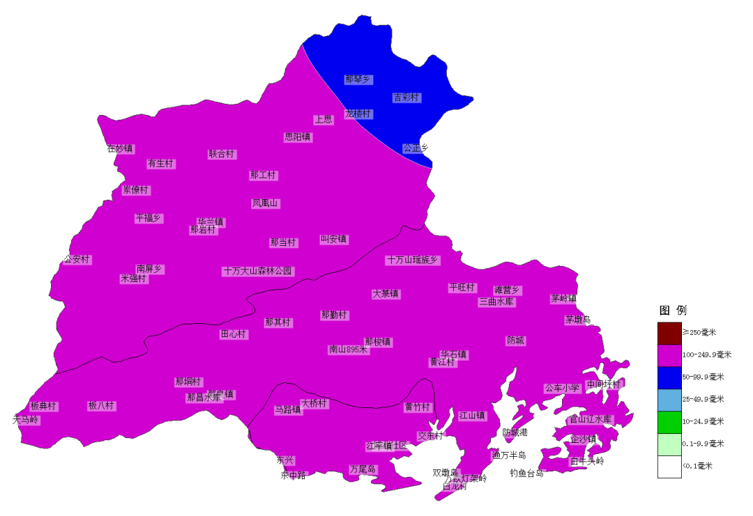 预计,受台风“麦德姆”环流影响,5日白天我市风力逐渐加大到阵风7~8级,5日晚上至6日我市将有一次强风雨天气过程,我市大部有暴雨到大暴雨,累计雨量100~150毫米、局地200毫米以上,最大小时雨量40~60毫米,局地80毫米;陆地最大阵风9~11级,北部湾海面最大阵风11~13级。具体预报如下: