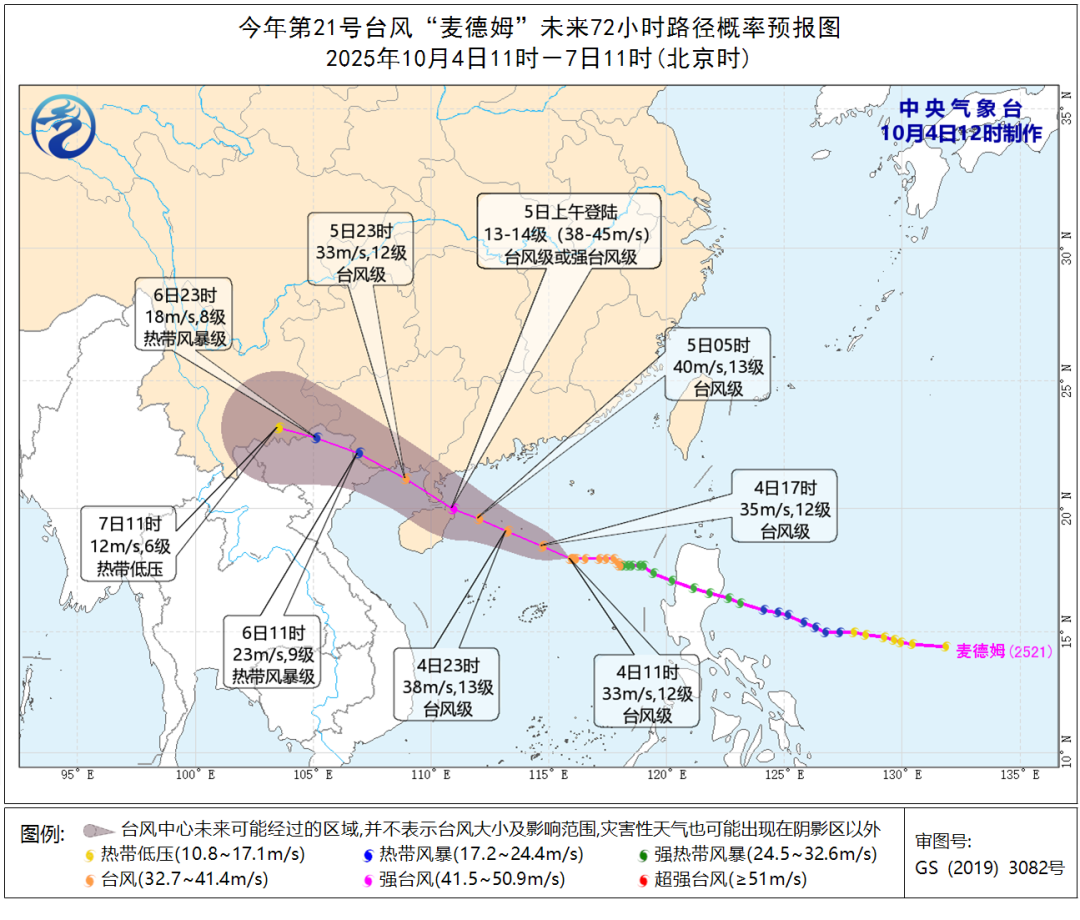 今年第21号台风“麦德姆”今天(4日)凌晨由强热带风暴级加强为台风级,上午11时其中心位于广东省湛江市徐闻县东偏南方约650公里的南海北部海面上(北纬18.0度、东经115.9度),中心附近最大风力有12级(33米/秒),中心最低气压为975百帕,七级风圈半径300~380公里,十级风圈半径80~100公里。