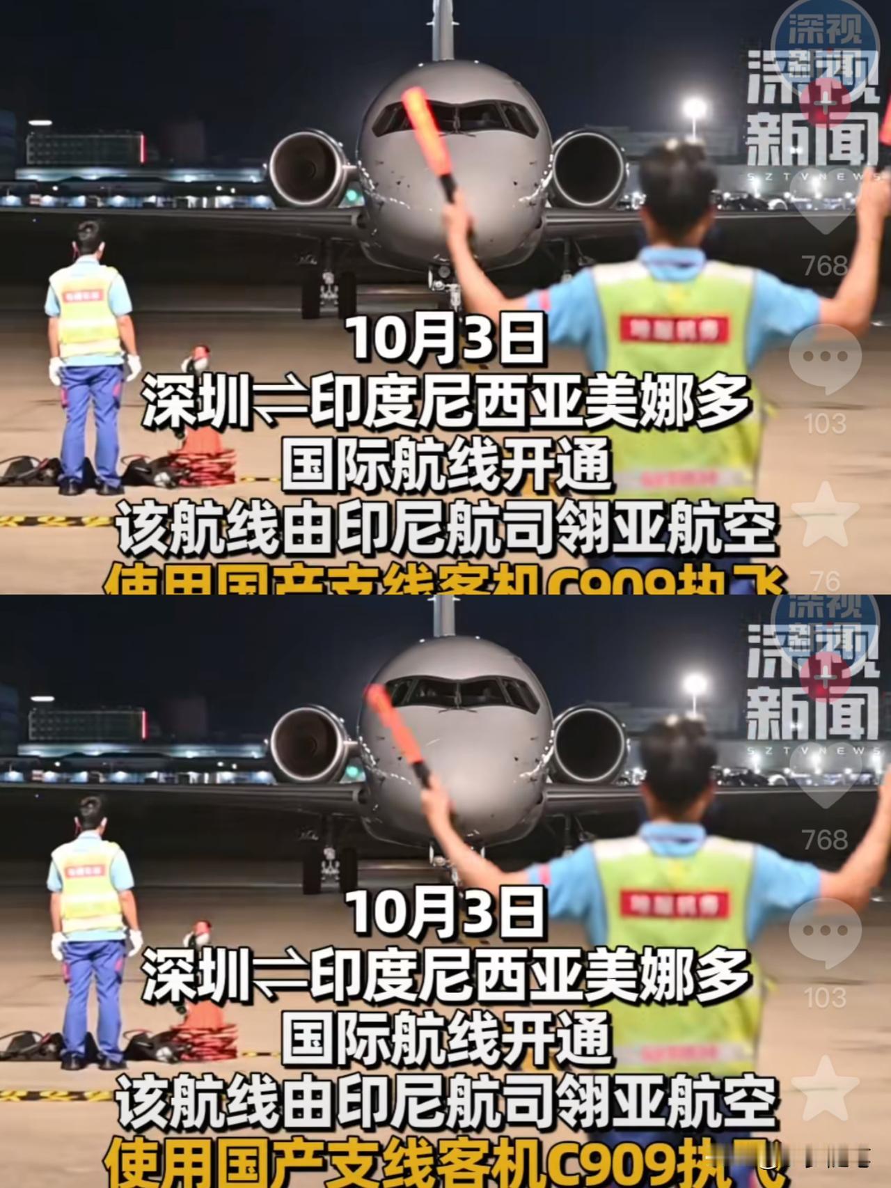 快讯!快讯 中国正式宣布了 2025年10月3日正式宣布深圳直飞印尼美娜多国际航线开通。 国产C909稳稳停在跑道上,机身涂装亮眼,印尼航司的制服和"中国制造"标识凑在一起,这可是它头回从深圳飞国际线! 别只觉得去美娜多潜水更方便了,这事儿根本是国产飞机的"国际秀场"。 C909早不是新手,交了160多架、拉过2400多万人,现在被印尼航司买去当主力,还选在建交75周年开通航线,这信任度藏都藏不住。 从C919飞国内到C909闯国际,国产飞机不是偶尔亮相,是真的站稳了脚。这哪是开通一条航线,分明是中国造的底气在天上飞。 你以后选航班,会优先pick国产客机吗?