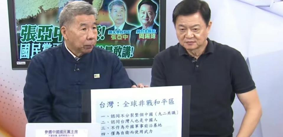 张亚中,你这主张哪是什么统一,你这和“维持现状”有什么区别? “井底梦想家”吗? 张亚中于10月4号在周锡玮节目上再次重点提到他的两岸主张,他坚持自己的“和平备忘录”,认为只要他当选国民党党主席以后就可以有机会来这边谈“和平备忘录”,甚至扬言要签“和平协议”,张亚中还说以后要把岛内打造成“全球非战和平区”,就像欧洲的瑞士那样,永享和平,如此一来,世界五百强、一千强企业都会去台湾投资。 更是提到让他们参与一些国际组织活动。 张亚中制作了一个板子上,上面标题是“全球非战和平区”,有四大点内容: 一、认同“九二共识”。 二、认同台湾人也是中国人。 三、不作为外国军事前沿基地。 四、仅为自卫而使用武力。 我看到张亚中整体的论述以后,我的第一反应是:这种主张不叫统一,这和维持现在这样的状况没有本质上的区别。 1、现在岛内就有不少深蓝人士和蓝营支持者、统派认同“九二共识”。 2、认同台湾人就是中国人属基本,岛内除了绿营,大部分人都有这个概念,只是近些年来被绿营“独派”侧翼恐吓而不敢说而已,最近因馆长带头,不少人又开始敢于认同自己中国人身份,所以无需把这一点列为谈的条件。 3、现在湾湾也不是外部势力的前沿基地,如果今后敢那么做,我认为正义之师就会兵临城下。 4、仅作为自卫而使用武力?学小日子呢?还想着武力保存?做梦呢?那还叫什么统一?有武力就会有后续大麻烦的可能性,真统就不允许保留武力,警力可以。 所以说张亚中这种主张不是真统,这和“维持现在状态”没有多大区别,变着法的拖。 他在幻想以后发达了,借这边的优惠和世界五百强企业助力他们发达了,再做打算?要不然你还要提出“仅自卫使用武力”干什么呢?对谁自卫?你这种论述简直做梦。 好处都是你们的,你们永享和平,你们发达,你们受到优待,你们参与国际活动,你们有武力自卫。 请问:你们付出了什么?凭什么好处都是你们的? 典型的“井底梦想家”。